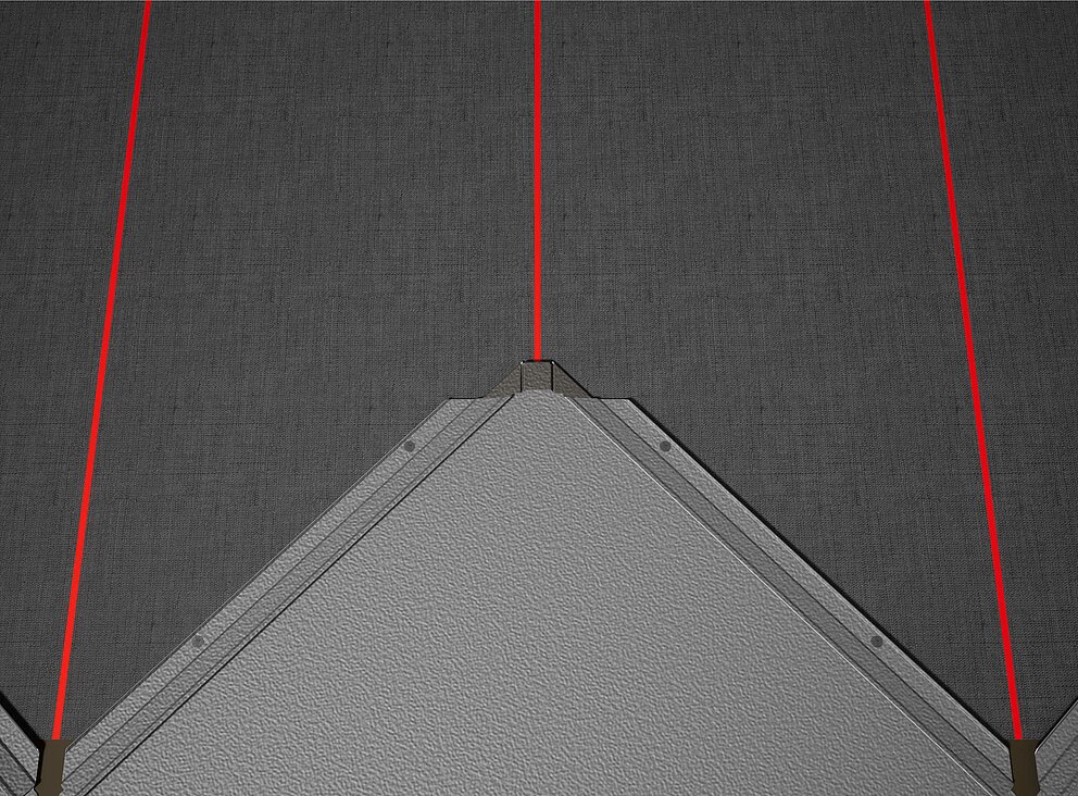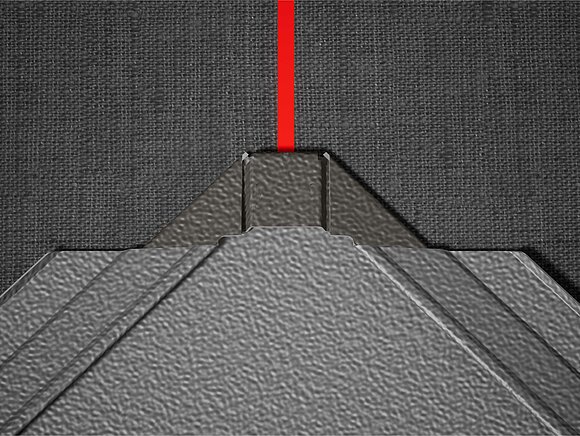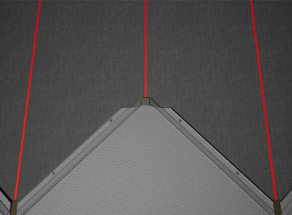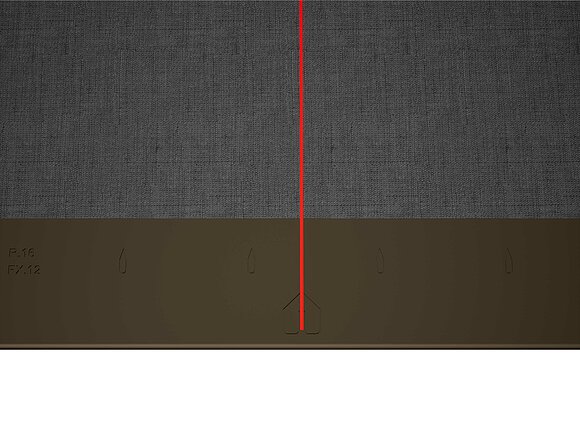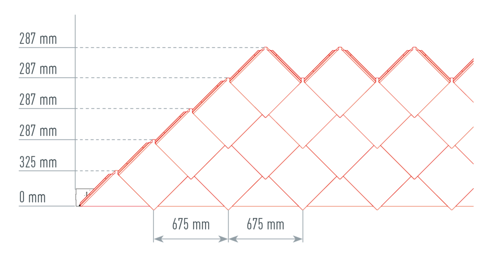 Zur Hilfestellung bei der Verlegung der PREFA Dachrauten 44 × 44 empfiehlt es sich, einen Raster aus senkrechten Schnurschlägen im Abstand von 675 mm herzustellen (als Hilfestellung dienen die Markierungen im Saumstreifen). Um das Schnürmass in jeder Reihe genau einzuhalten, kann bei Bedarf auch das halbe Schnürmass angezeichnet und in regelmässigen Abständen geprüft werden. Richten Sie die Startplatten mit den Markierungen (an der Oberkante der Startplatten) an den senkrechten Schnurschlägen aus (siehe Abbildung unten). Hierbei ist zu beachten, dass der Bereich für die seitliche Aufkantung (z. B. Ortgangausbildung) nicht mittig in den Dachrauten 44 × 44 liegt (Symmetrie/Dachmitte beachten).