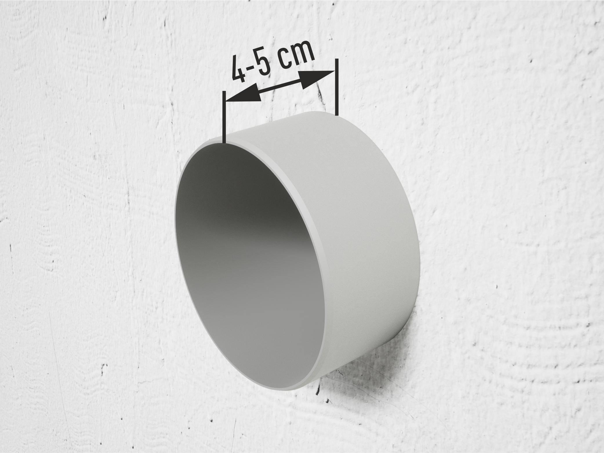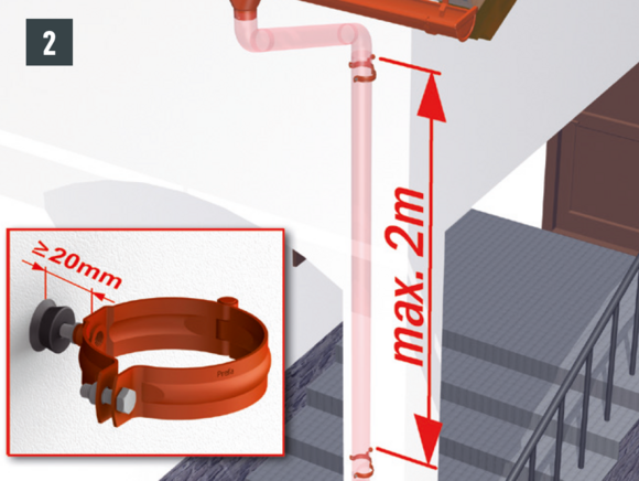 Die Rohrschellen sind so zu montieren, dass mind. 20 mm Abstand zwischen Rohrrückseite und Fassade eingehalten wird. Der Abstand der Rohrschellen untereinander soll nicht mehr als 2 m betragen. (Nationale Normen und Fachregeln können grössere Abstände zulassen. Aufgrund der Länge der PREFA Fallrohre von 3 m hat sich ein Abstand von max. 2 m als praktikabel erwiesen.)