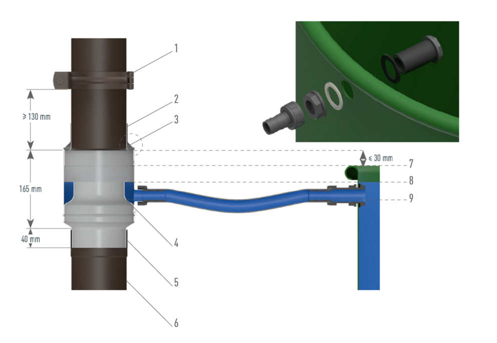 Durch den Regenwassersammler wird die Regentonne bei Niederschlag direkt über das Ablaufrohr mit Regenwasser befüllt und sammelt das Wasser bis zur gewünschten Höhe.