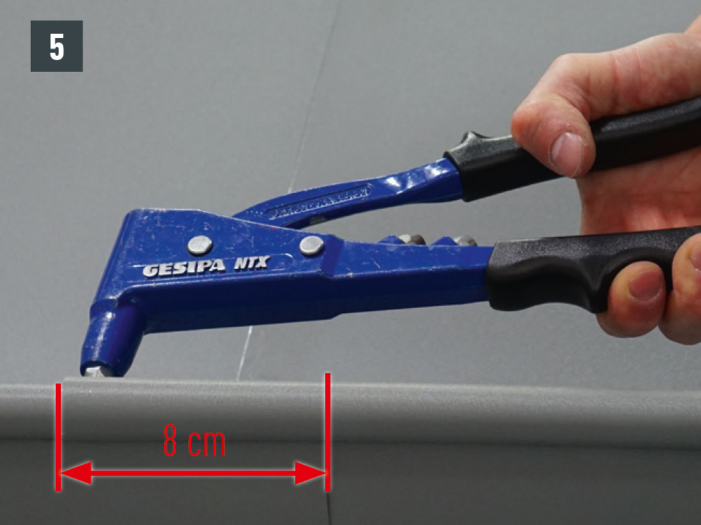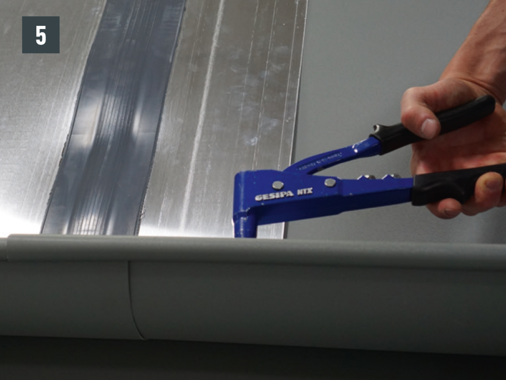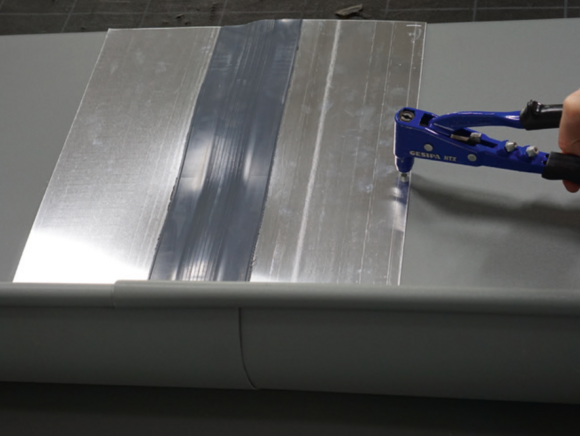 Die Saumrinnenverbindung kann auch als Nietverbindung mit 20 Stk. PREFA Patentnieten 4 x 9,5 mm im Kreuzstich und Abdichtung mittels PREFA Spezialsilikon hergestellt werden.