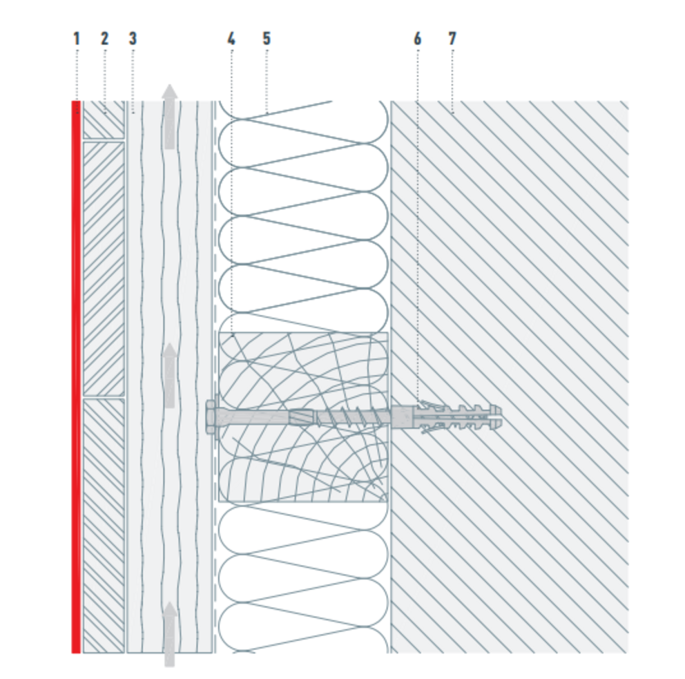 Der Hinterlüftungsspalt muss je nach Materialwahl der Unterkonstruktion den national geltenden Anforderungen entsprechen. Um in der Hinterlüftungsebene einen ungehinderten Strömungsverlauf zu gewährleisten, müssen die Tragprofile vertikal ausgerichtet werden. Die darauf montierte Vollschalung ist horizontal ausgerichtet auszuführen.
