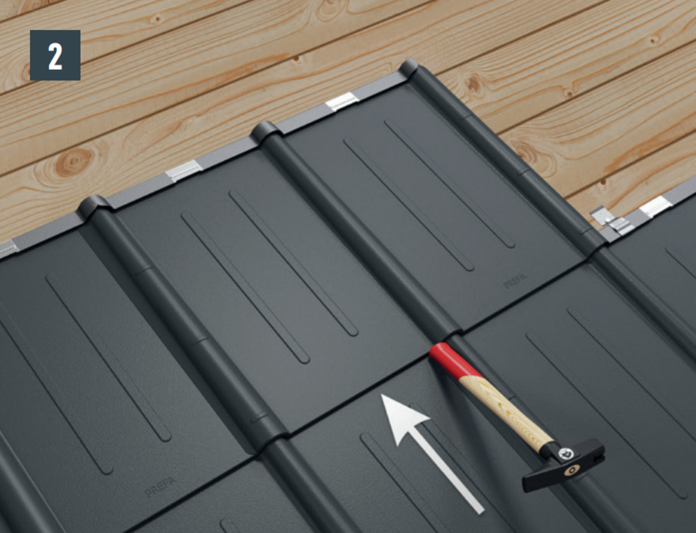Drücken Sie die Platte in den Hakenfalz. Stossen Sie an der Plattenunterkante leicht mit dem Hammerstiel nach (Bild 2).