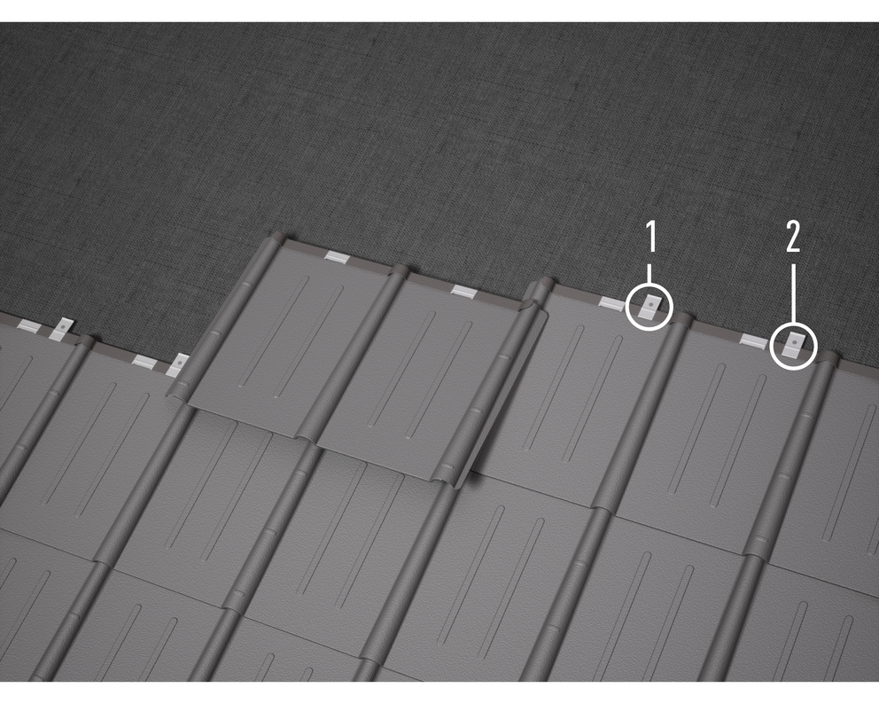 Die Hafte müssen ca. 3 cm neben der Plattenrille gesetzt werden. In besonders sturmgefährdeten Gebieten ist eine Windlastberechnung erforderlich und die Befestigung entsprechend der Berechnung zu erhöhen bzw. eine geschraubte statt genagelte Befestigung zu verwenden. Ist die Befestigung mit erhöhter Haftanzahl laut Berechnung nicht ausreichend, kann zusätzlich eine direkte Befestigung seitlich am Wellenauslauf (unterliegende Welle) mit 2 Stück SPAXSchrauben pro Platte angebracht werden.