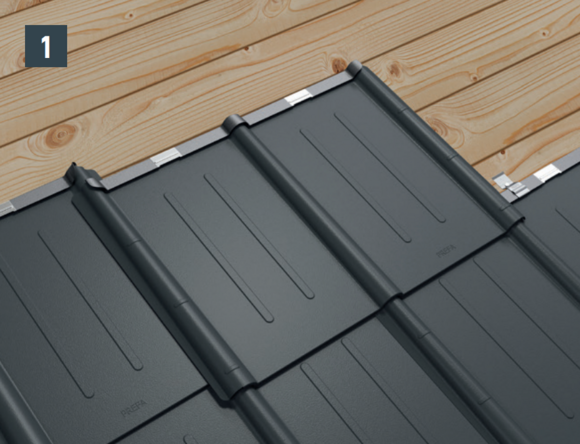Die Dachplatten machen eine Verlegung in beide Richtungen möglich. Die Dachplatten werden immer im Verbund, das heisst stossversetzt, gedeckt. Halbe Platten und Froschmaulluken können auch Stoss über Stoss gedeckt werden (Bild 1).