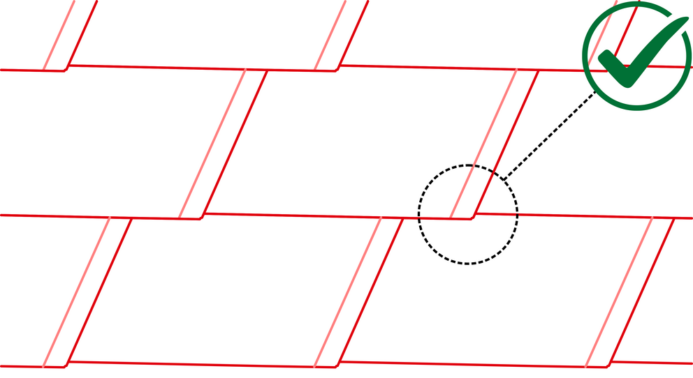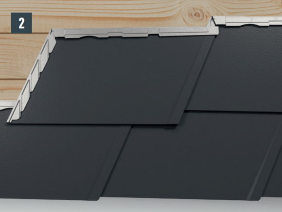 Durch die Form der Dachschindel DS.19 ergibt sich an der Ferse der Dachschindel DS.19 eine Absenkelung. Halten Sie diese Absenkelung auch bei der Verlegung der ersten Dachschindel DS.19 in jeder Reihe ein, indem Sie die erste Dachschindel DS.19 nicht bis ganz nach oben in den Saumstreifen bzw. Falz hochschieben. Lassen Sie die Ferse der ersten Dachschindel DS.19 so weit nach, bis der obere Schindelumschlag über die gesamte Länge gerade durchläuft. Ein Überziehen der ersten Dachschindel DS.19 muss vermieden werden.