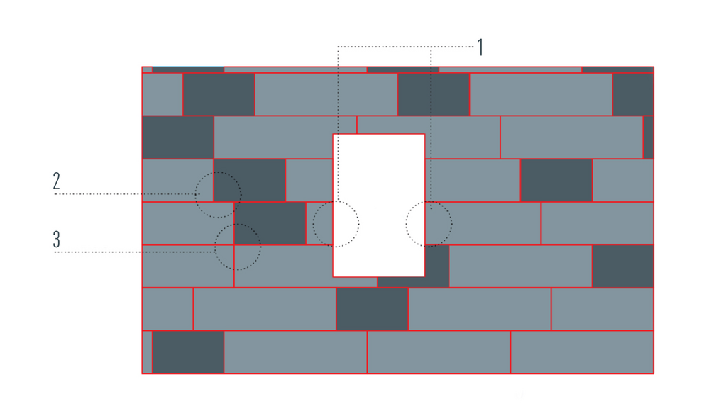 Ein abgeschnittenes FX.12-Paneel wurde an der anderen Seite der Öffnung weiterverwendet (1). Somit ist eine korrekte Stossverteilung nicht mehr gewährleistet (2) und kann im schlimmsten Fall zu einer Überlappung der Stösse führen (3). Deshalb wurden Verlegebeispiele für einen optimalen Stossversatz erstellt.