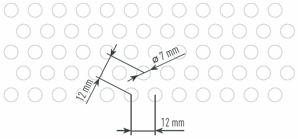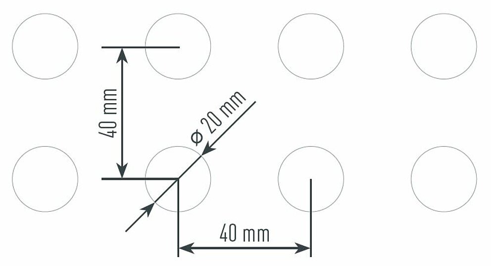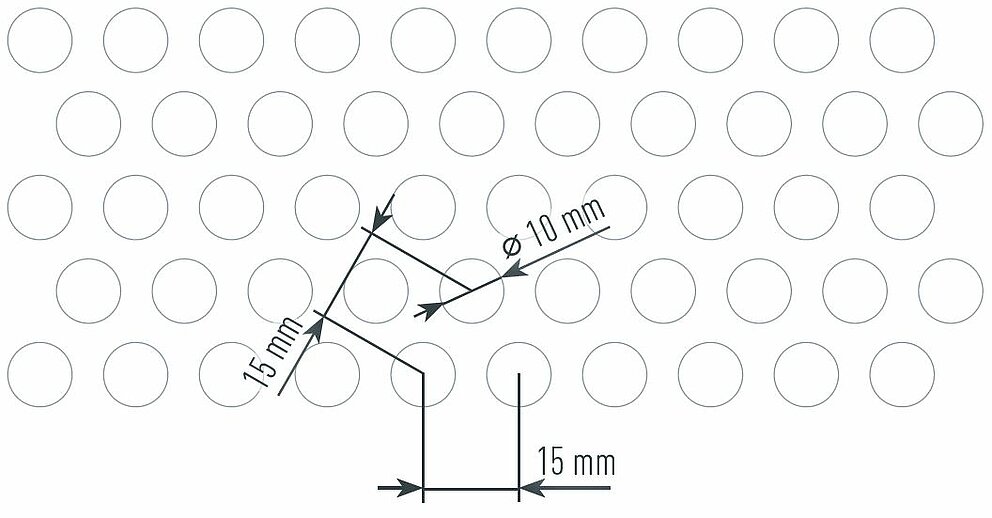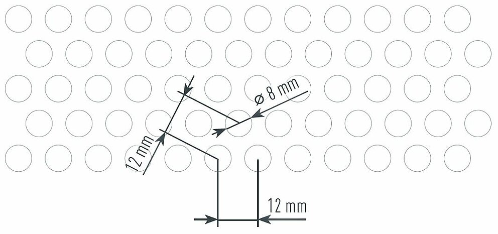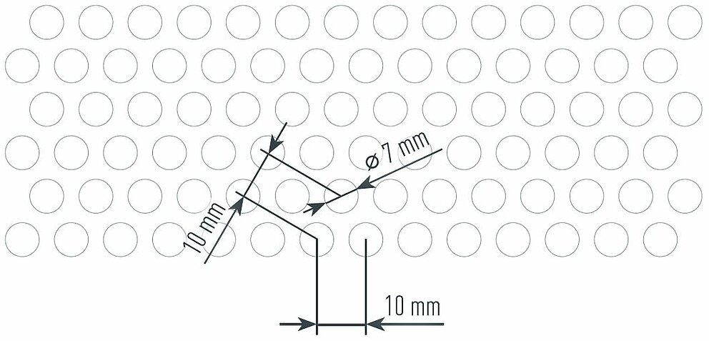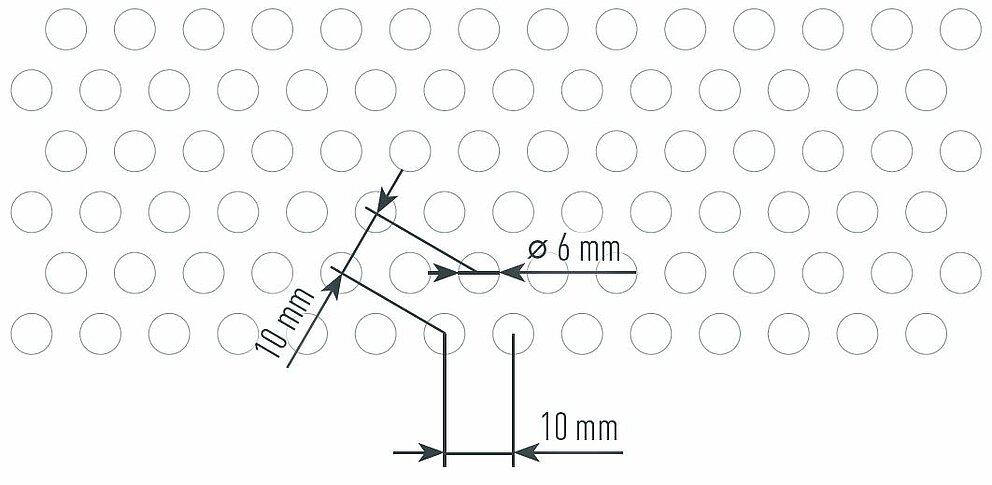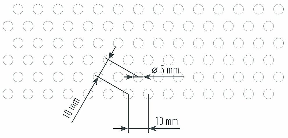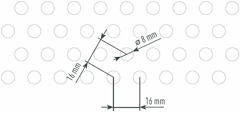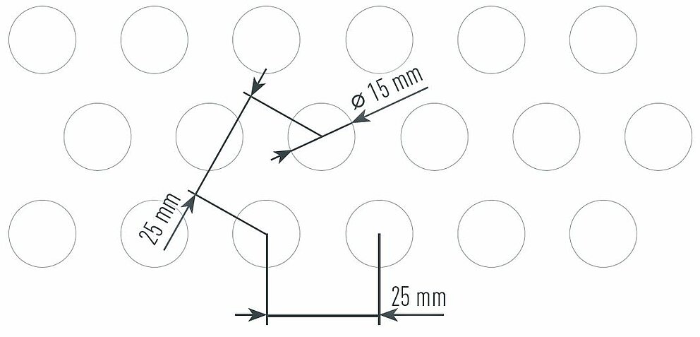 Perforierte PREFABOND Verbundplatten verfügen über ein gleichmässiges Lochmuster. Aufgrund der Mineralstruktur des Kerns wird eine Perforierung mit Stanzmaschinen für die PREFABOND mit A2-Kern nicht empfohlen.