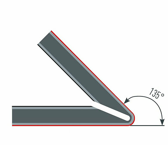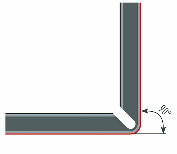 Beachten Sie, dass die Verbundplatten nach dem Abkanten wieder etwas zurückfedern. In der Praxis bedeutet dies, dass die Abkantung etwas stärker als gewünscht gebogen werden muss, um nach dem Nachfedern die perfekte Masshaltigkeit aufzuweisen. Die kleinstmögliche Schenkellänge einer Abkantung beträgt 20 mm.