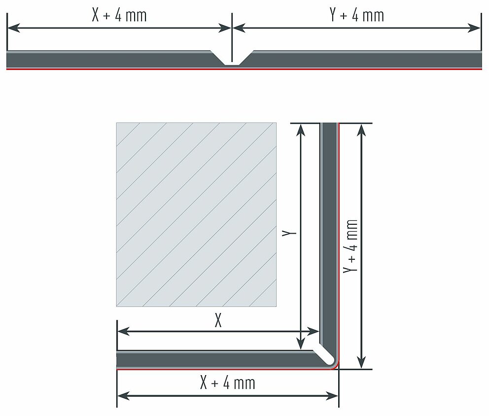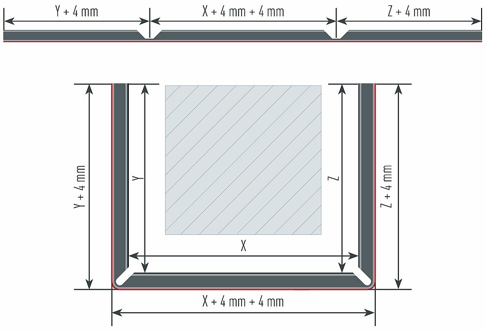 Bei einer U-Kantung mit zwei Aussenecken wird jede Ecke einzeln betrachtet. Um die korrekte Fräsachse zu erreichen, muss jedem Schenkel die Materialstärke (4 mm) hinzugefügt werden.