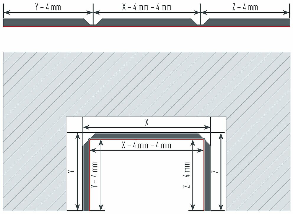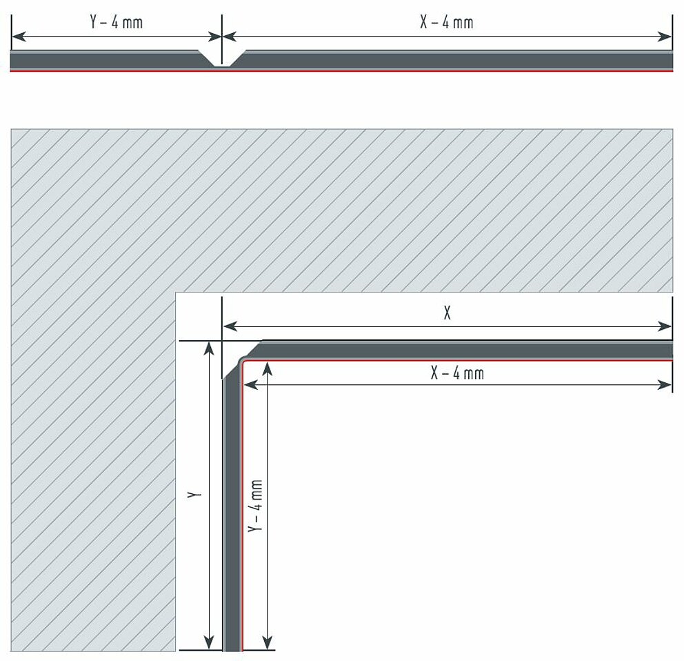 Bei einer Innenecke ist die Materialstärke der Verbundplatte (4 mm) von den gemessenen Naturmassen abzuziehen.