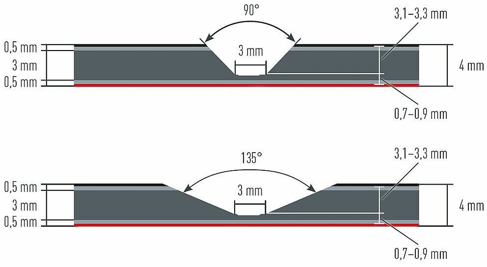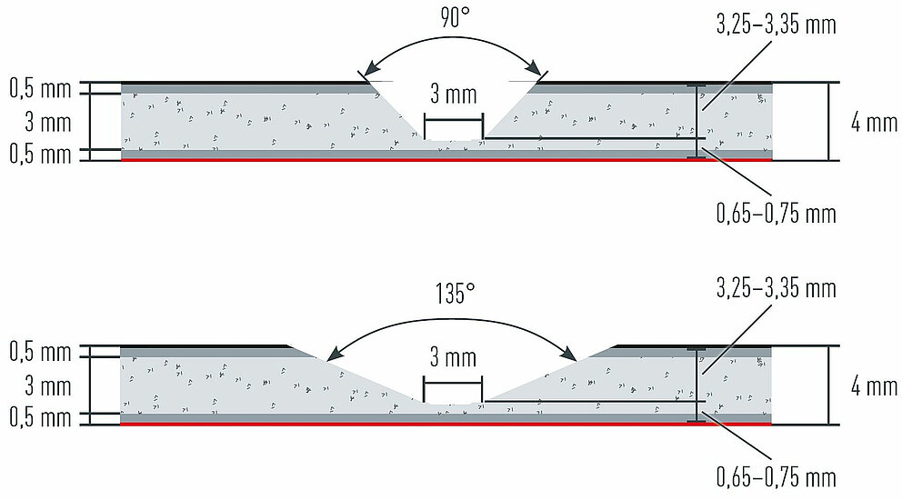 Die für eine Abkantung erforderliche V-Nut wird, unabhängig ob Innen- oder Aussenecke, immer auf der Plattenrückseite gefräst. Eine korrekte V-Nut-Fräsung ist so auszuführen, dass einerseits 0,5 mm des Deckbleches (lackierte Sichtseite) und andererseits beim Kern weitere 0,2 bis 0,4 mm (FR-Kern) resp. weitere 0,15 bis 0,25 mm (A2-Kern) erhalten bleiben.