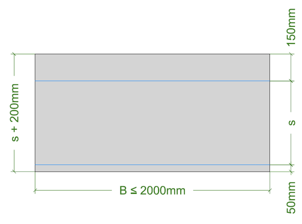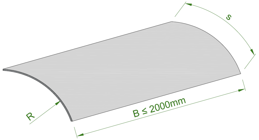 Bedingt durch das Biegen mit Walzen haben die Platten einen Auslauf mit einer kleinen Druckstelle, die durch PREFA zurückgeschnitten wird. Beachten Sie die Abmessungen des Rohmaterials! Der Zuschnitt ist nämlich an den Plattenenden um 200 mm grösser als das effektiv benötigte Bogenmass. Zum Bogenmass (s) werden an einem Ende 150 mm und am anderen 50 mm addiert.