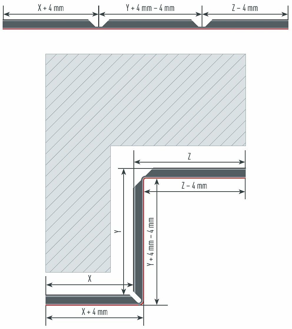 Bei einer Aussenecke ist die Materialstärke der Verbundplatte (4 mm) den gemessenen Naturmassen hinzuzufügen.