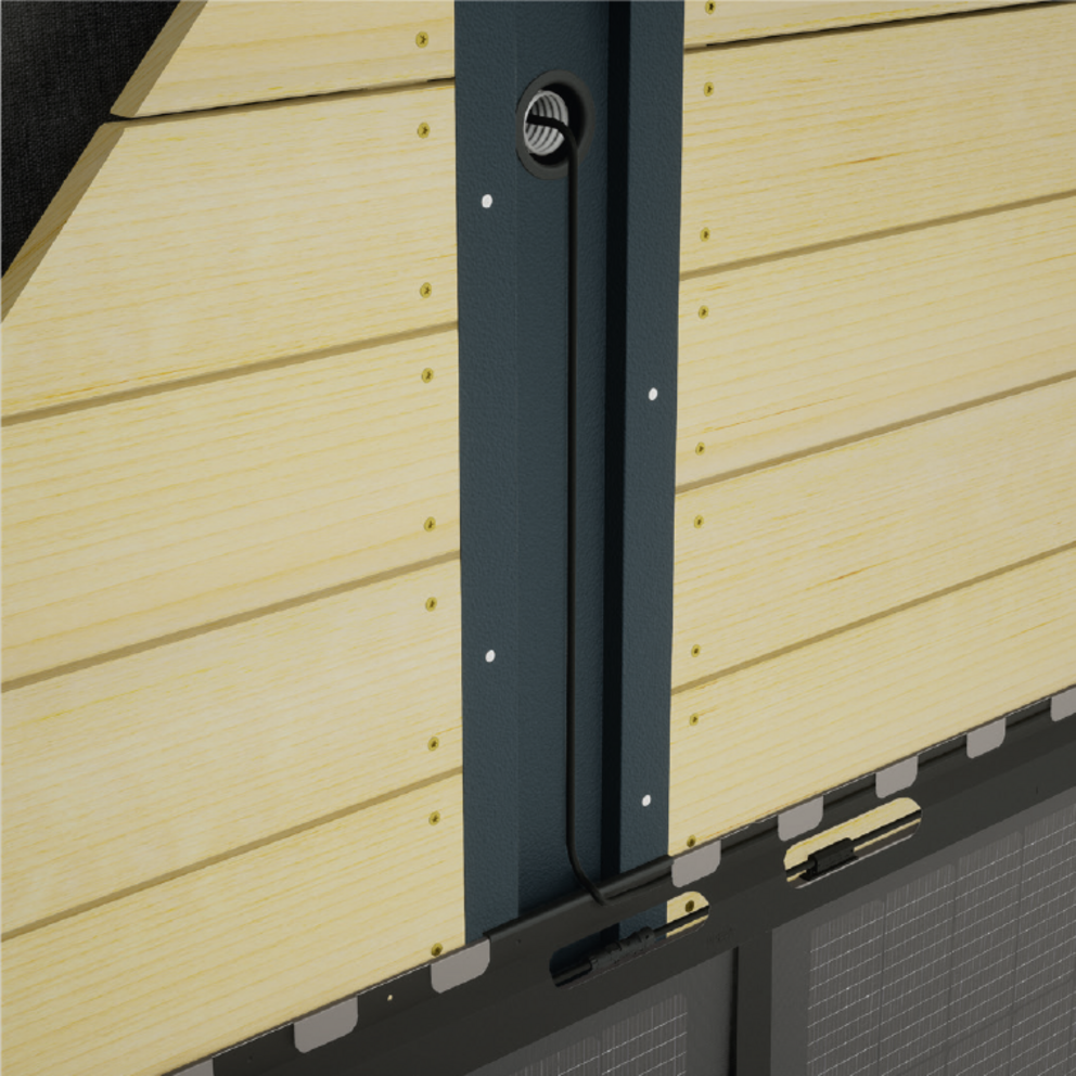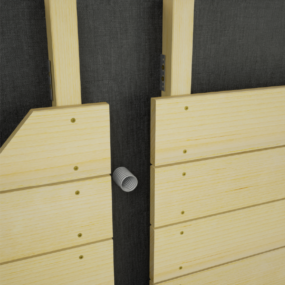 Im Bereich der Wanddurchführung ist der Kabelkanal aus Ergänzungsband zu positionieren. Dabei ist darauf zu achten, dass die Holzschalung in diesem Bereich entsprechend ausgespart wird, um den Kabelkanal passgenau und bündig in die Wand einzulassen.