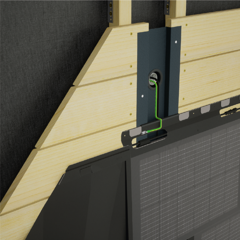 Einlegen der Strangableitung sowie Montage der Potentialausgleichsleitung an der Solardachplatte mit der mitgelieferten Befestigung