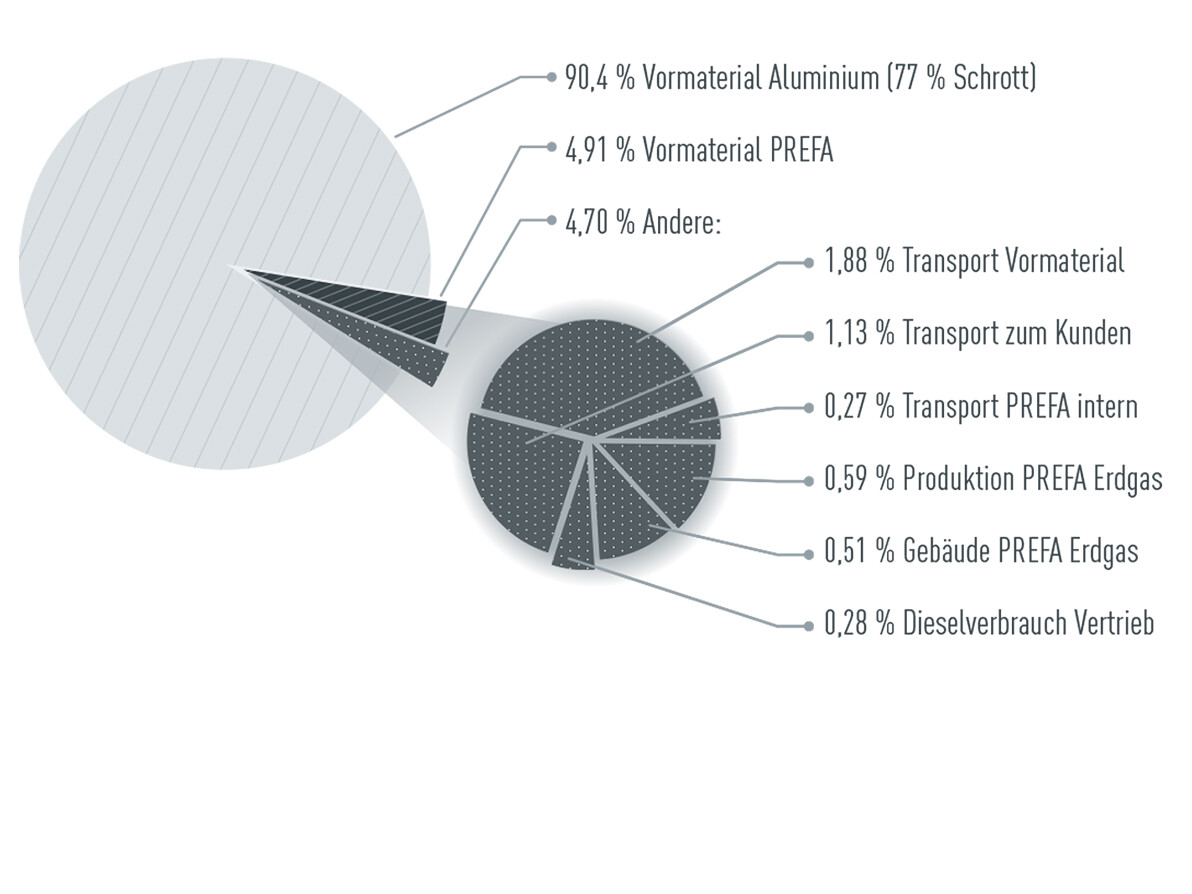 Recycling von 1 Tonne Aluminium bedeutet 4 Tonnen weniger Bauxit und bis zu 9 Tonnen weniger CO2-Emissionen. Durch den Einsatz von Sekundäraluminium unserer Lieferanten kann für unser Vormaterial ein CO2-Faktor von 4,48 kg CO2-Ausstoß/kg Vormaterial berechnet werden (23 % Primäraluminium).