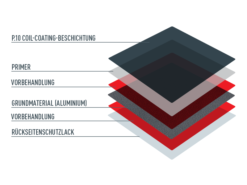 Seit dem Jahr 2010 wurde mit der Oberflächenbeschichtung P.10 eine Lackqualität geschaffen, die durch eine spezielle, nur unter dem Mikroskop sichtbar werdende Faltenstruktur im Lack für unzählige Kleinstreflexionen und Farbechtheit sorgt. Bei direkter Sonneneinstrahlung erscheint die matte Oberfläche des P.10 Lackes in einer edlen Optik. Die hochwertige Lackschicht der PREFA Produkte ist verformbar und hält Temperaturschwankungen und Witterungseinflüssen bestens stand.