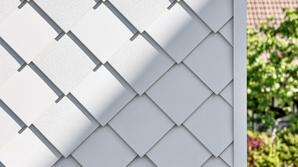 Ein weisser Gebäudemantel aus PREFA-Rauten: Die ganze Gebäudehaut aus PREFA-Materialien
