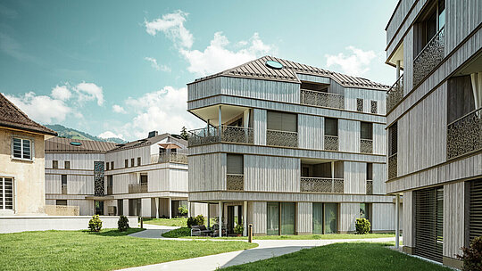 L’architecte et urbaniste Ihab Morgan, du cabinet zurichois Townset, a orchestré la composition architecturale du site : les bâtiments sont orientés pour offrir des panoramas époustouflants sur les montagnes, le parc et la villa historique. Les larges espaces entre les bâtiments s’intègrent naturellement au cadre, où règne un charme de quartier, et insufflent une atmosphère harmonieuse. À première vue, les bâtiments paraissent similaires, mais leur conception révèle une orchestration réfléchie : chaque bâtiment épouse élégamment la pente naturelle, tandis que la répartition des étages a été modulée pour une intégration harmonieuse dans le paysage.