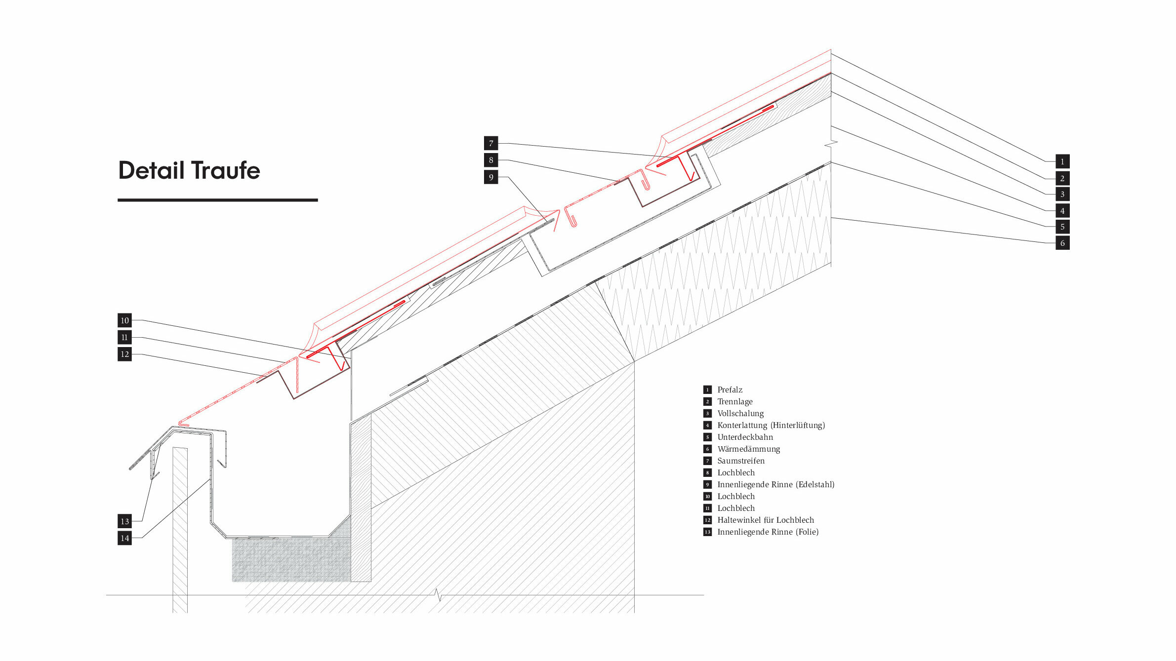 La singularité du projet réside dans la toiture des nouveaux bâtiments, composée de 60 surfaces distinctes aux inclinaisons et formes variées. Elle a été conçue pour refléter à la fois le caractère de la villa historique et la silhouette des montagnes environnantes. Recouverte de bandes d’aluminium PREFALZ, la toiture se distingue par sa résistance exceptionnelle aux conditions climatiques extrêmes de la région alpine. Les couvertures à joints debout s'étendent sur plusieurs surfaces de toiture, créant ainsi une toiture continue et visuellement homogène. À la place des finitions de zinguerie traditionnelles, des canaux d’évacuation invisibles ont été installés au niveau des gouttières, des arêtes, des noues et des faîtages. Ces canaux, parfaitement alignés avec la couverture et recouverts d’un métal perforé assorti à la couleur de la toiture, assurent une apparence uniforme et parfaitement lisse. Les 45 fenêtres de toit rondes ont représenté un véritable défi technique. Leur intégration précise dans la géométrie sophistiquée des surfaces de toiture a nécessité des découpes sur mesure et une organisation méticuleuse. Pour parfaire l’ensemble, l’évacuation des eaux pluviales a été assurée par des gouttières invisibles.