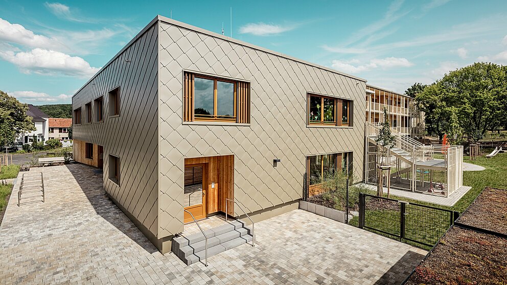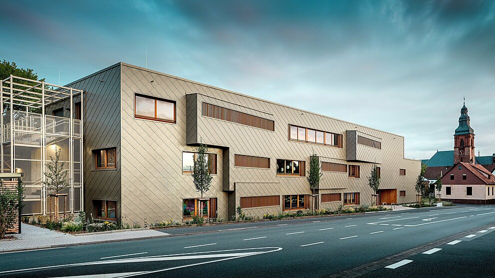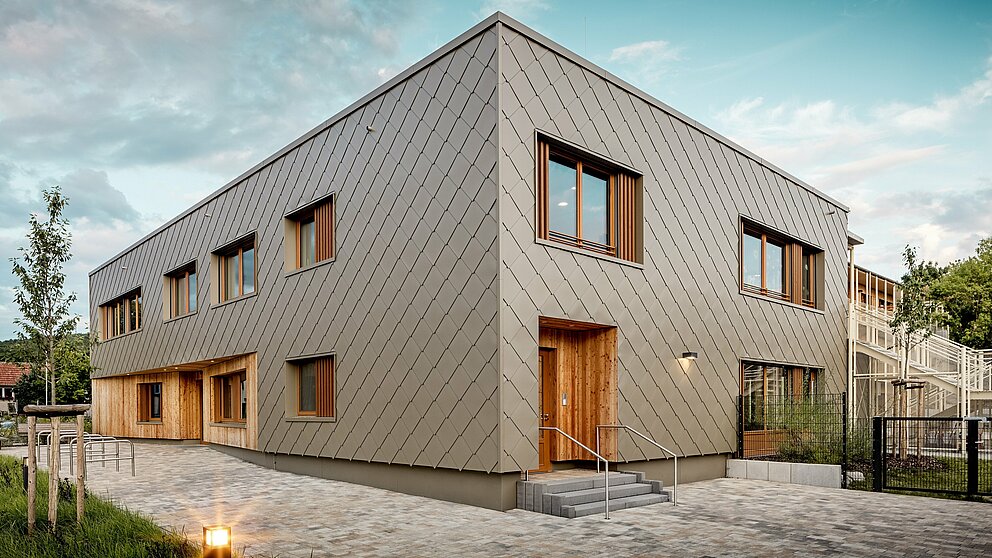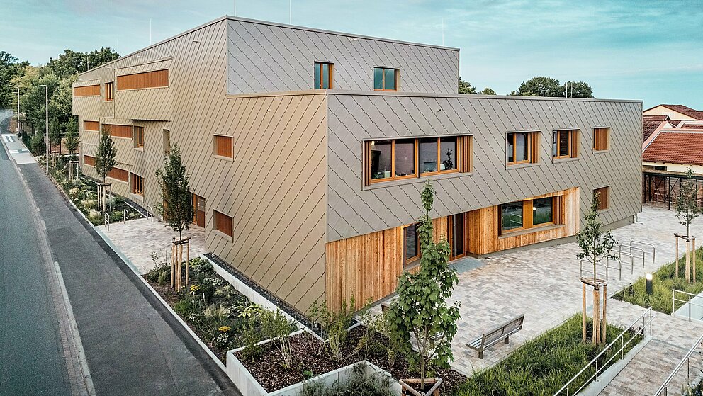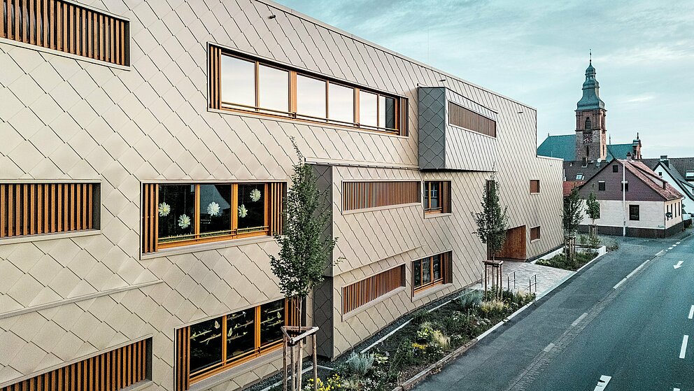 Den bronzefarbenen Aluminiummantel legte die Spenglerei ASA Schüßler um das Gebäude. Das fränkische Traditionsunternehmen hat bereits das zweite PREFARENZEN Projekt in Alzenau erfolgreich umgesetzt. Für das Hybridgebäude wurden etwa 3.500 der 44 × 44 Zentimeter grossen PREFA Wandrauten in Bronze montiert – jede einzeln verdeckt mit PREFA Rillennägeln auf die hölzerne Vollschalung angebracht. Die zahlreichen Gebäudeecken und Leibungen sind mit Taschenprofilen und Standard-Eckwinkeln besetzt.