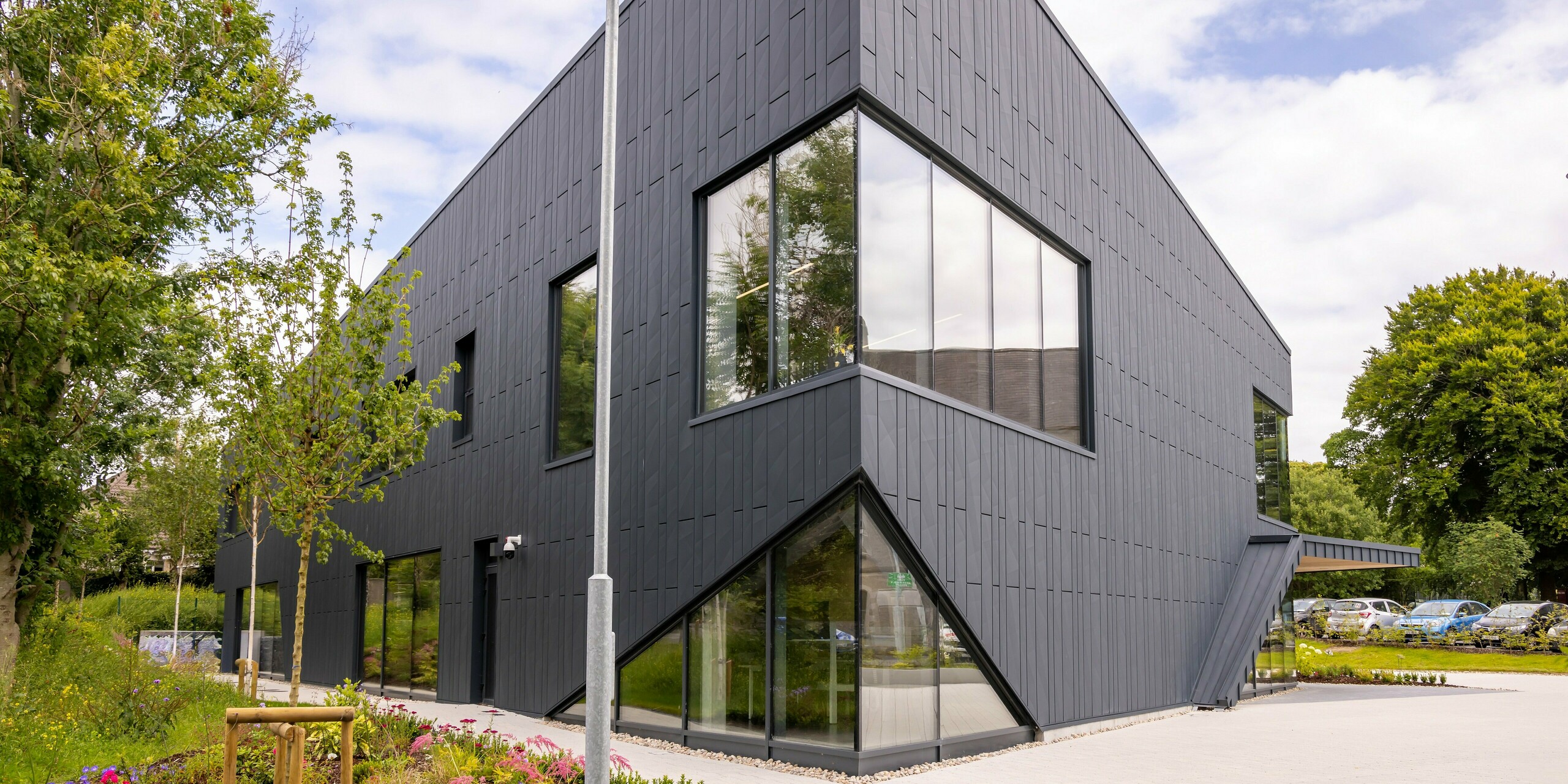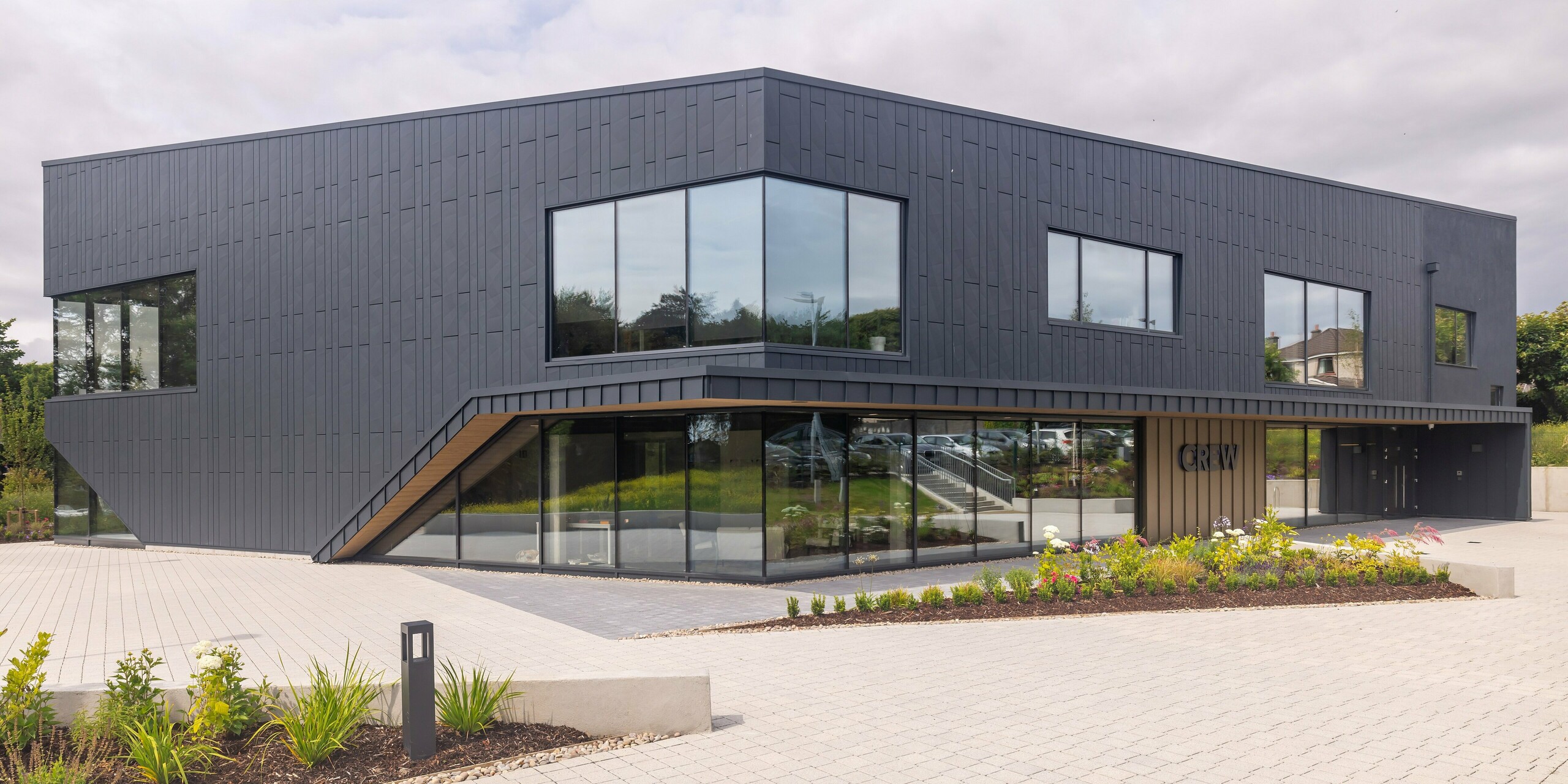Für die eindrucksvolle Gebäudehülle kamen die extravaganten Sidings X Fassadenpaneele sowie PREFALZ in der Farbe P.10 Anthrazit zum Einsatz.