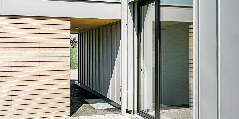 Zur Verkleidung dieses Doppelhauses mit zwei Satteldächern wurde Prefalz in Patina Grau für das Dach und die Fassade verwendet. Außerdem wurden die PREFA Kastenrinne und das PREFA Quadratrohr in Patina Grau beschichtet um mit der Außenhülle zu harmonieren. Zu dem Aluminium wurden auch Holzelemente kombiniert, wie z.B. die geschützten Bereiche am Balkon unter dem Dach oder die Trennung zwischen den Beiden Haushälften.