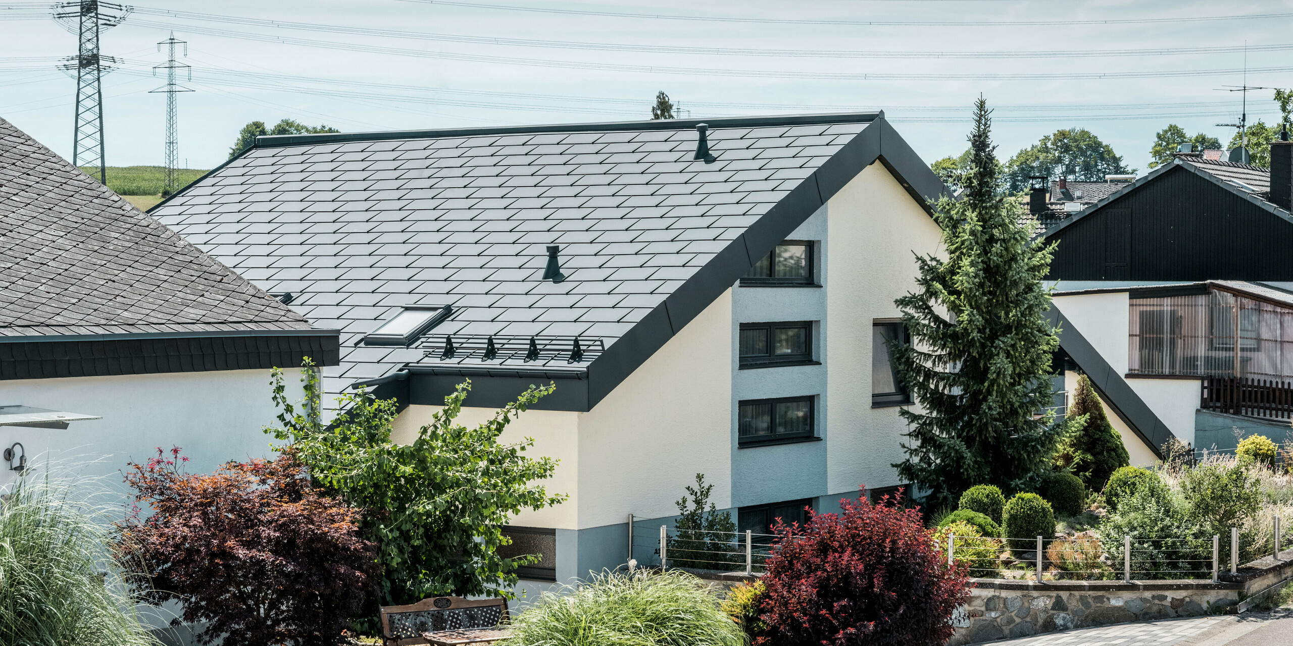 Für die Sanierung eines Einfamilienhauses in Besslich, Ortsgemeinde Newel in Rheinland-Pfalz wurde die PREFA Dachplatte R.16 in der Farbe P.10 Anthrazit verwendet. Das PREFA Dachentwässerungssystem ist in der gleichen Farbe gehalten.