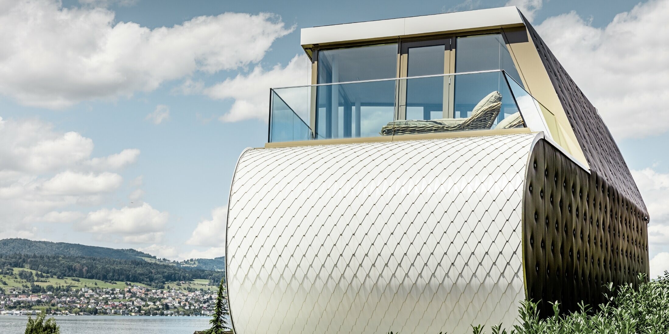 Das ausgezeichnete Flexhouse in Meilen, Zürich, wurde vom Architekten Stefan Camenzind entworfen. Das Gebäude besteht aus Geschossen, die jeweils auf einer Seite mit einer halben Rundung aus Holzbögen abgeschlossen werden. Daraus ergibt sich eine einzigartige Dynamik. Die kleinen PREFA Dachrauten in Reinweiß passen sich den Rundungen perfekt an und verstärken die Dynamik des Hauses.