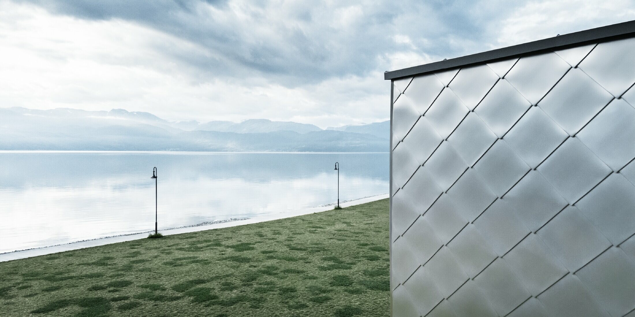 Inspiriert durch traditionelle Bauweisen verwendeten die Architektinnen Schiefersteine und vertikale Holzverschalungen. Repräsentative Gebäude wurden früher in der Gegend mit Rauten aus Schiefer eingedeckt, da diese wie eine landestypische Art des Pfefferkuchens aussehen. LINK Arkitektur interpretierte die Formen der traditionellen Dachdeckung an der uferseitigen Fassade mit blanken 44×44 Rauten von PREFA neu.