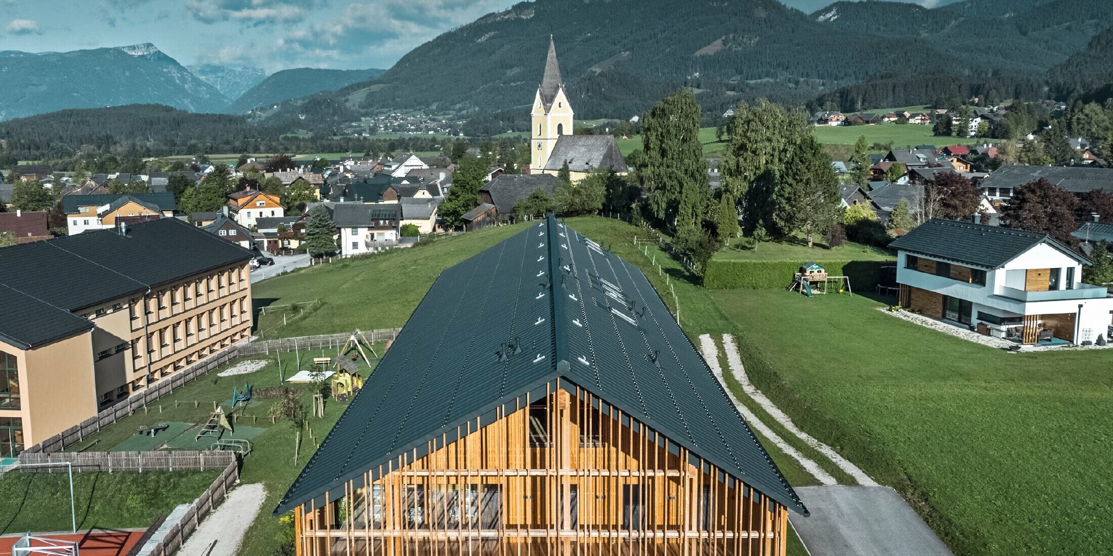 Dans cette région, les bâtiments sont traditionnellement construits avec un rez-de-chaussée construit en dur, du bois posé à la verticale à l’étage supérieur et un toit à deux versants. Cette manière de construire se retrouve également dans cette crèche qui met l’accent sur le contact des enfants avec la nature. Le toit recouvert de Prefalz PREFA en P.10 anthracite donne à cette nouvelle construction moderne un côté simple et élégant.