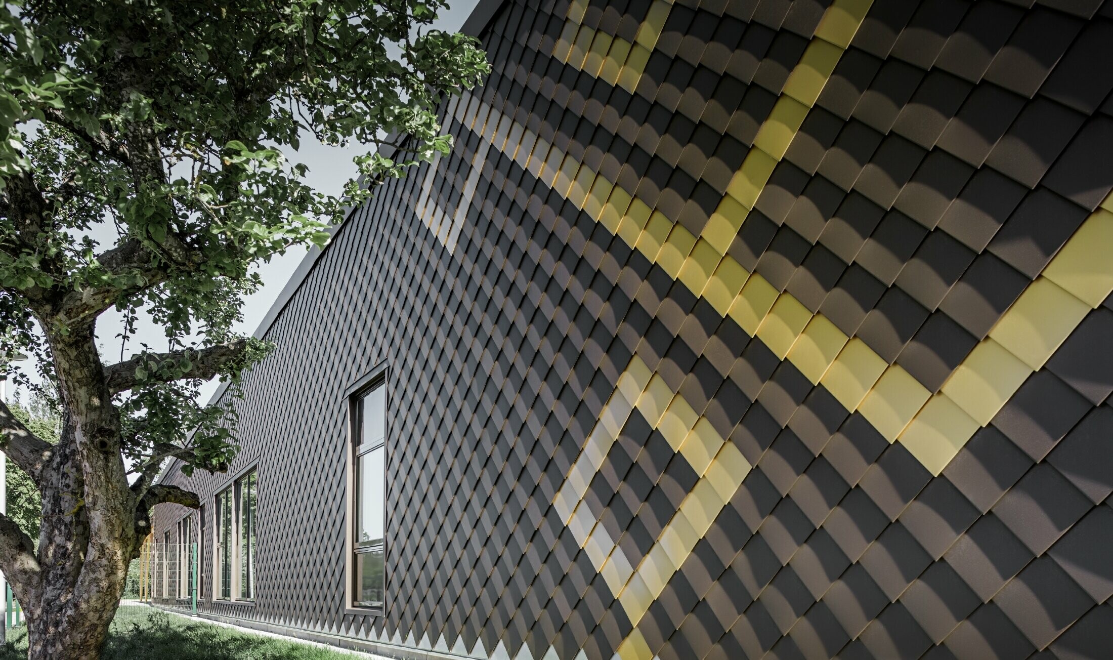 Pour l’école maternelle de Stockholm, il a fallu trouver une solution de façade robuste résistant aux jeux des enfants, aux tirs de ballon, etc. C’est pourquoi la commune a opté pour la façade en aluminium de PREFA. Le choix s’est porté sur le losange de façade 20 × 20 couleurs P.10 brun et or maya.
