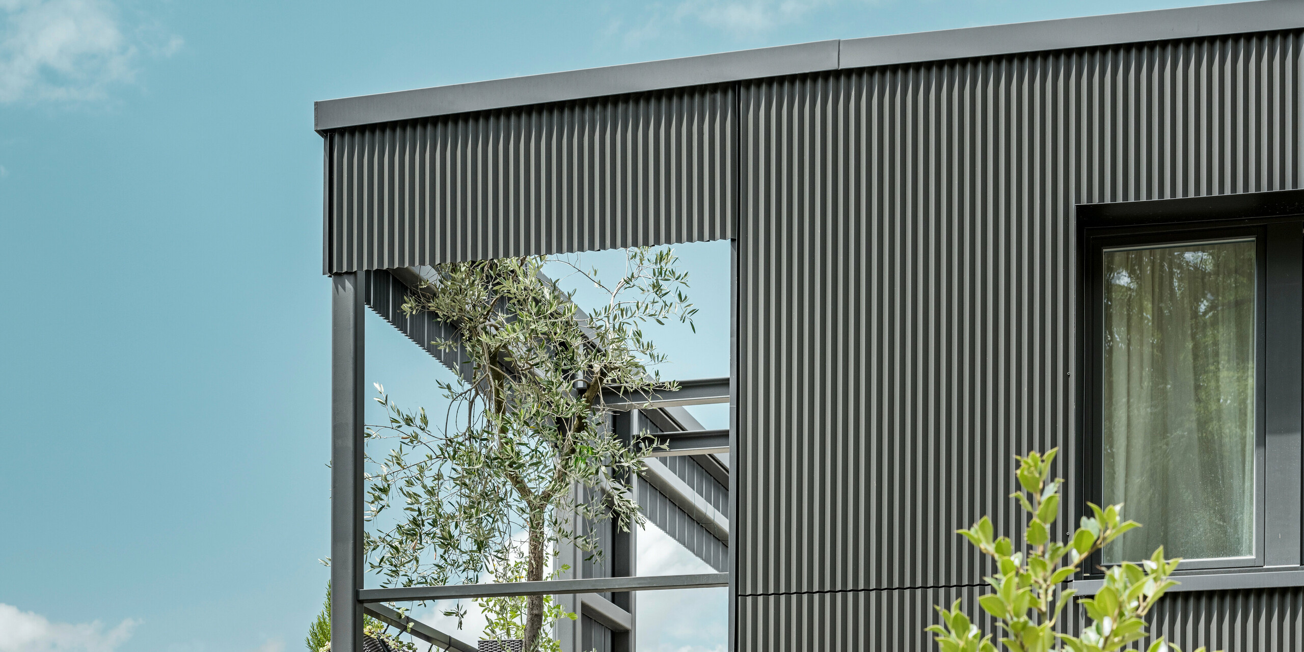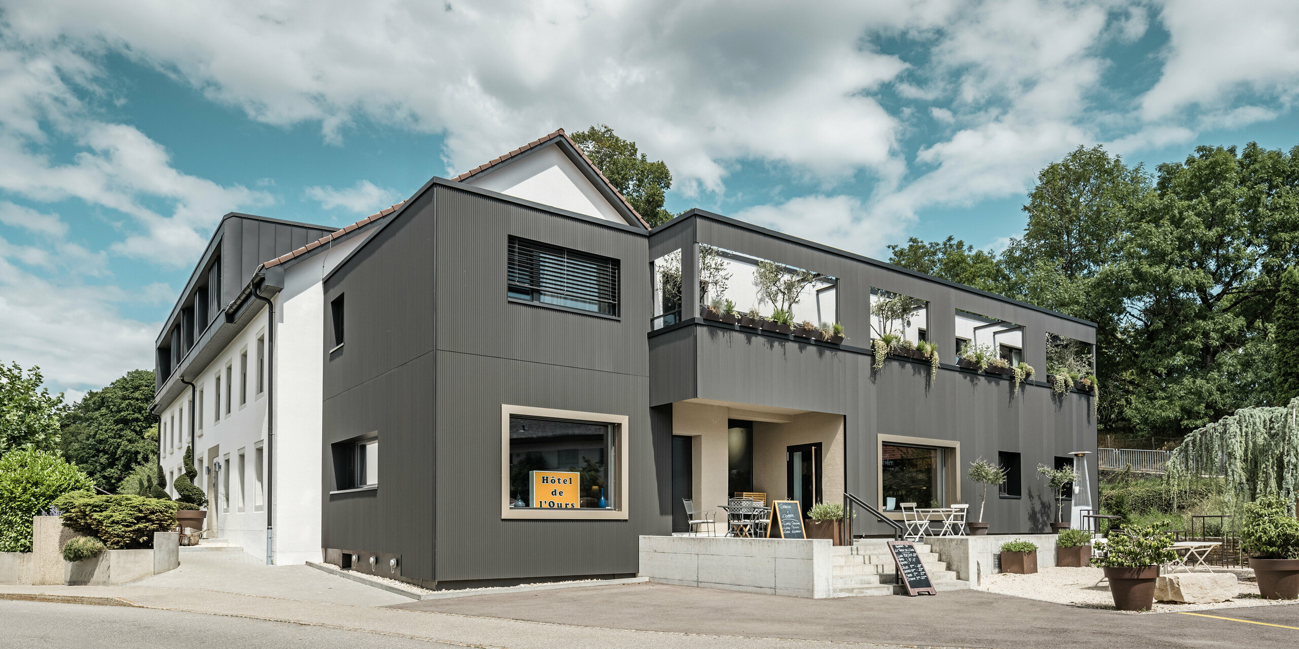 Environ 350 m² de profils triangle PREFA dans la couleur spéciale gris-noir ont été installés à l'Hôtel de l'Ours Prêles. Les profils extrudés confèrent à la façade de l'hôtel un design unique avec un jeu intéressant d'ombre et de lumière.