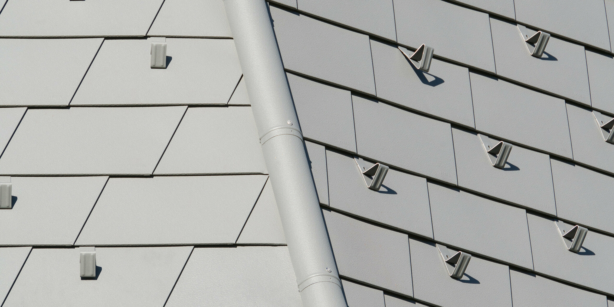 La vaste étendue de toiture d'une propriété à Barcelonnette, en France, a été rénové avec le bardeau de toiture PREFA en P.10 gris souris. Le pbardeau de toiture PREFA a été choisi pour ce projet de rénovation complexe car il convient à différentes formes de toit notamment grâce à sa flexibilité.