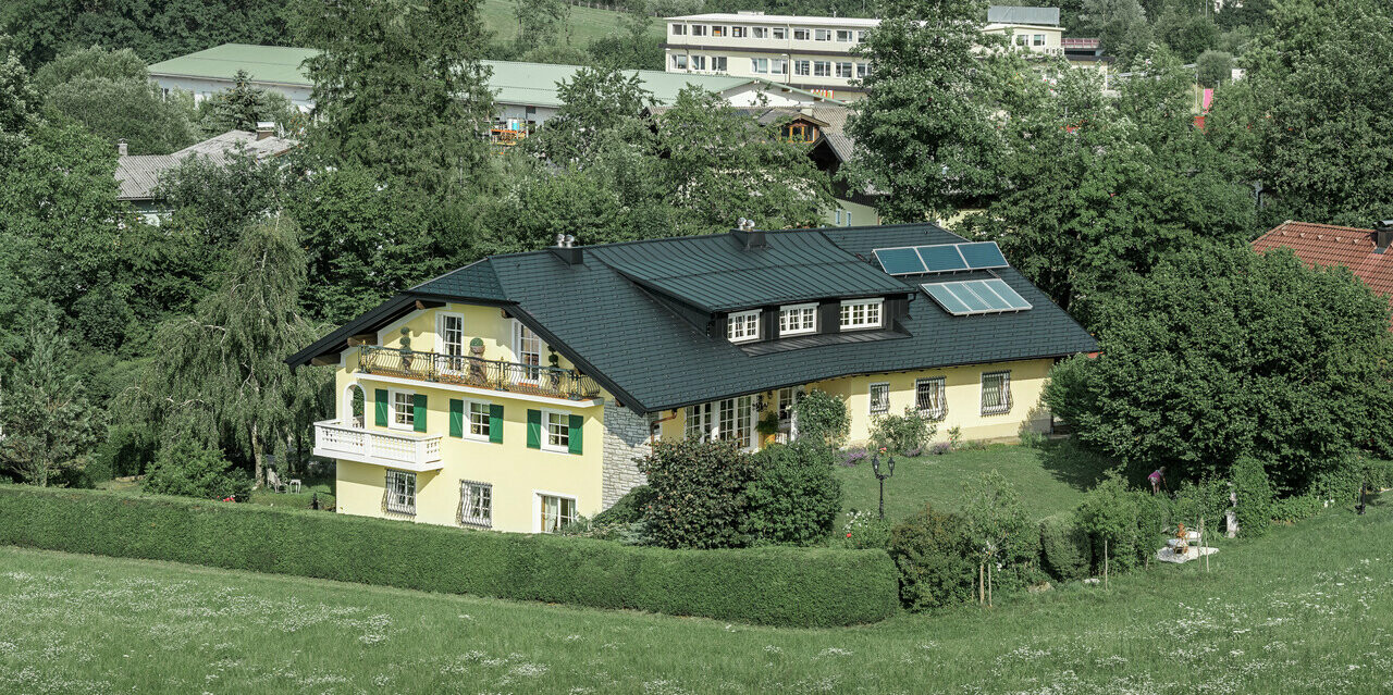 Le toit de cette maison traditionnelle a été rénové à l’aide de PREFALZ (pour la lucarne) et des DS.19 PREFA en P.10 couleur anthracite. Laissez-vous inspirer par nos nombreux bâtiments de référence !