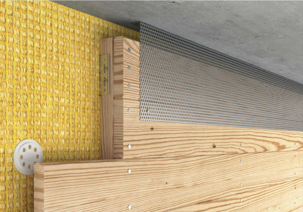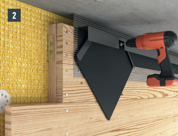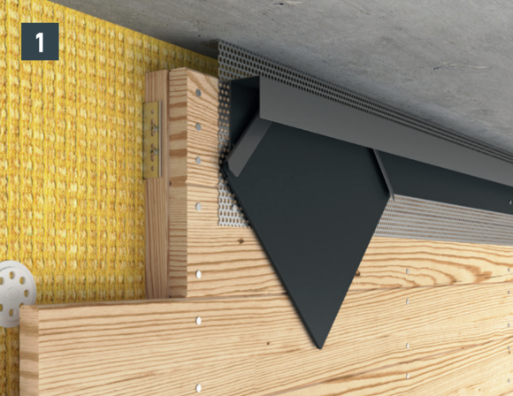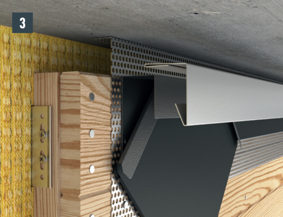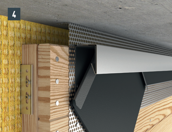 Pour que la façade soit bien ventilée, il faut prévoir une ouverture d’évacuation d’air au niveau du raccordement supérieur. Au niveau de l’ouverture d’évacuation d’air (par ex. sous-face de toiture), il faut monter une tôle perforée avec un repli à 90° afin d’obtenir une plus grande rigidité.