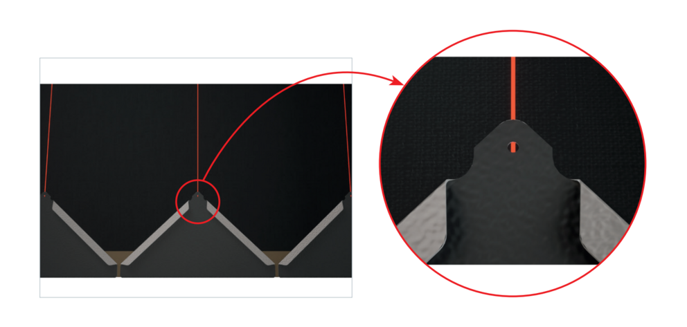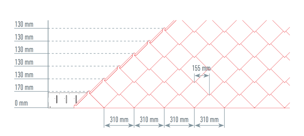 Pour faciliter la pose des losanges de façade 20 × 20 PREFA, il est recommandé de réaliser une trame de marques de cordeau verticales espacées de 310 mm (s’aider des repères dans la bande de départ). Pour respecter précisément la cote de traçage dans chaque rangée, on peut si nécessaire marquer aussi la moitié de la cote de traçage et la vérifier à intervalles réguliers. Alignez les demi-losanges de départ en fonction des encoches (sur le bord supérieur des demi-losanges de départ) avec les marques de cordeau verticales (voir figure ci-dessous). Les marques sur la bande de départ ne sont pas déterminantes pour le losange de façade 20 × 20. Lors de cette opération, veillez à ce que la zone pour le rebord latéral (p. ex. extrémité latérale ou angles de bâtiments) ne corresponde pas au centre des losanges de façade 20 x 20 (respecter la symétrie de la surface de la façade).