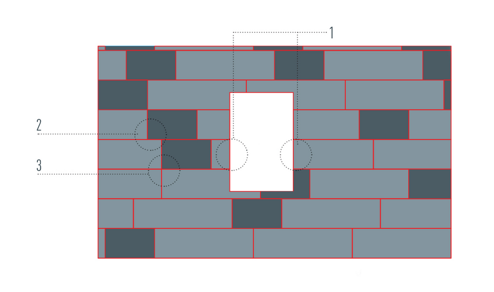 Un panneau FX.12 découpé a été réutilisé de l’autre côté de l’ouverture (1). La répartition des joints n’est donc plus correcte (2) et peut, dans le pire des cas, conduire à un chevauchement des joints (3). Pour éviter cela, des exemples de pose ont été créés afin d’obtenir un décalage optimal des joints.