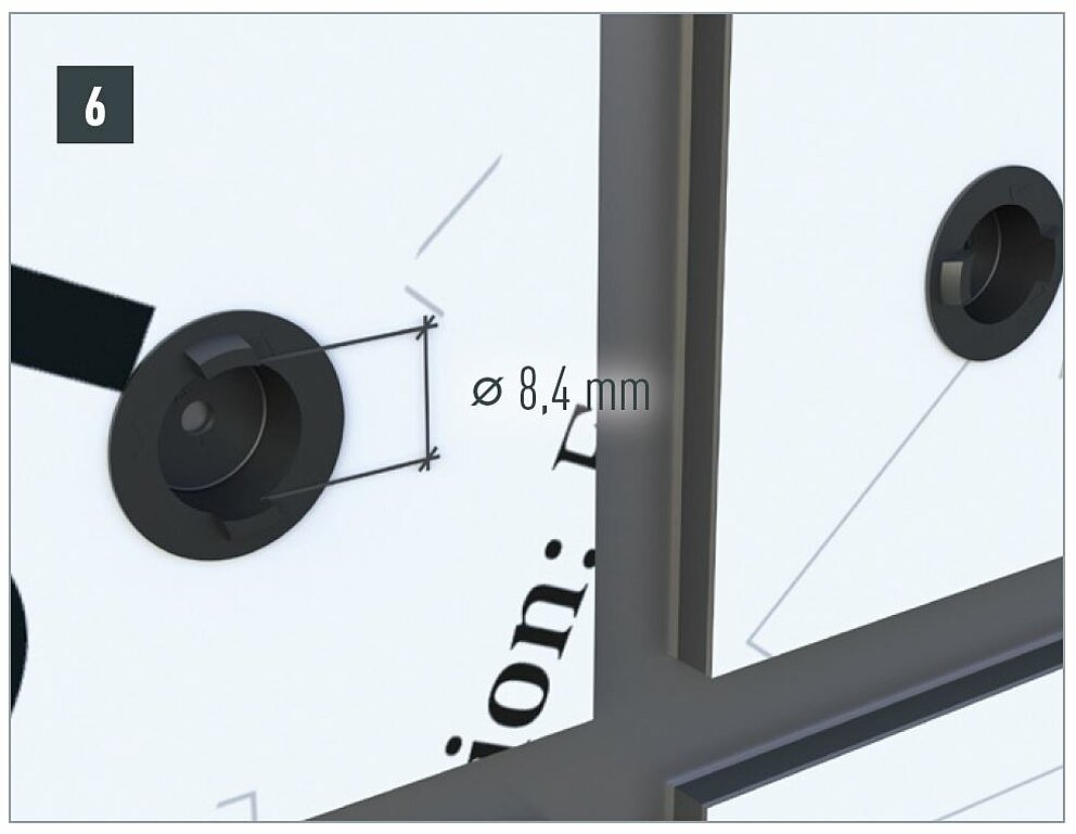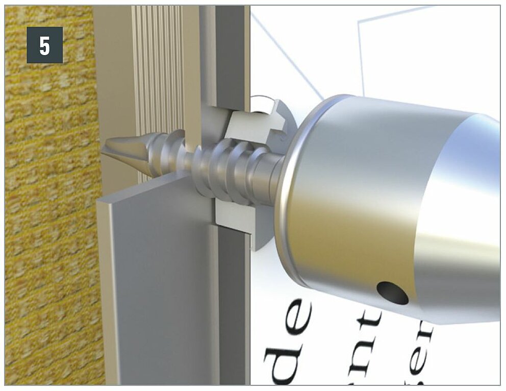 Le panneau composite PREFABOND étant à cet endroit solidement fixé à la sous-construction en bois, le point fixe empêche le panneau de bouger Insérez dans le trou une douille de guidage pour point fixe de 8,5 mm afin d’obtenir le diamètre requis de 5,1 mm. Vous pouvez ensuite visser.