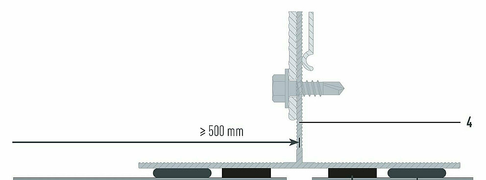 Pour pouvoir absorber correctement la dilatation thermique, ne jamais utiliser de profils porteurs de plus de 3 000 mm de long pour fixer la sous-construction. Veillez à ce que les profils de la sous-construction ne touchent pas un panneau, car la jonction ici est fixe.