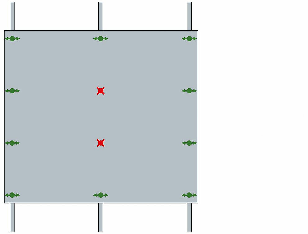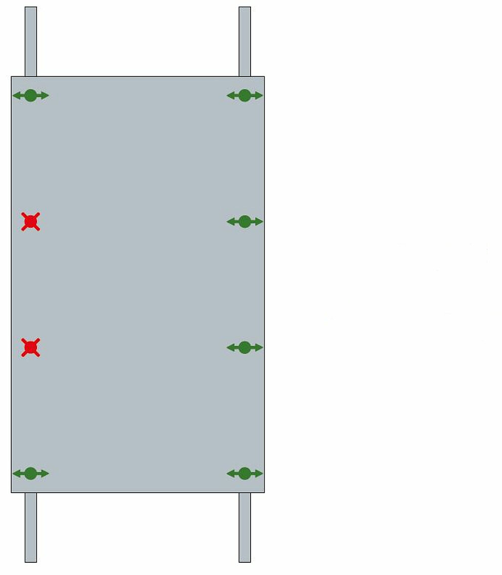 La fixation de chaque panneau requiert au moins 2 points fixes, et ce indépendamment de sa taille. Ce n’est qu’à cette condition que la stabilité du panneau pourra être assurée et que l’on pourra éviter que celui-ci se déforme.