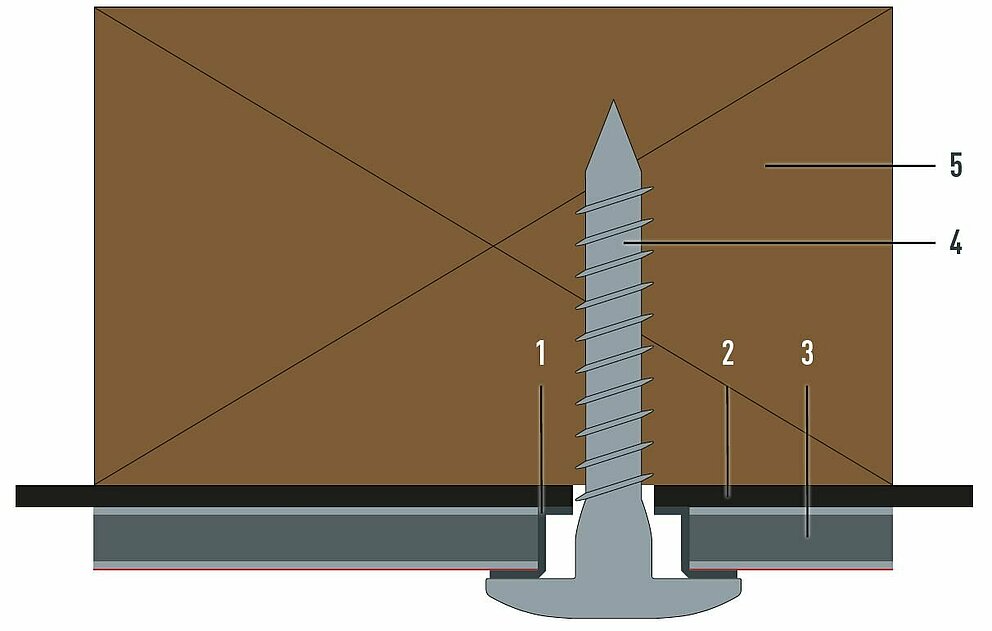 Pour une fixation mécanique sur sous-construction en bois, le point coulissant est réalisé de la même manière que le point fixe. Une seule différence : ne pas insérer de douille de guidage dans le joint d’étanchéité.