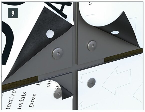 Avec le couteau PREFA 9,5 mm, incisez légèrement le film de protection autour du trou afin de pouvoir retirer facilement le film de protection une fois la pose terminée. Négliger cette opération serait risquer de voir le film coincé entre le panneau et la face inférieure de la tête de vis, ce qui en compliquerait le retrait.