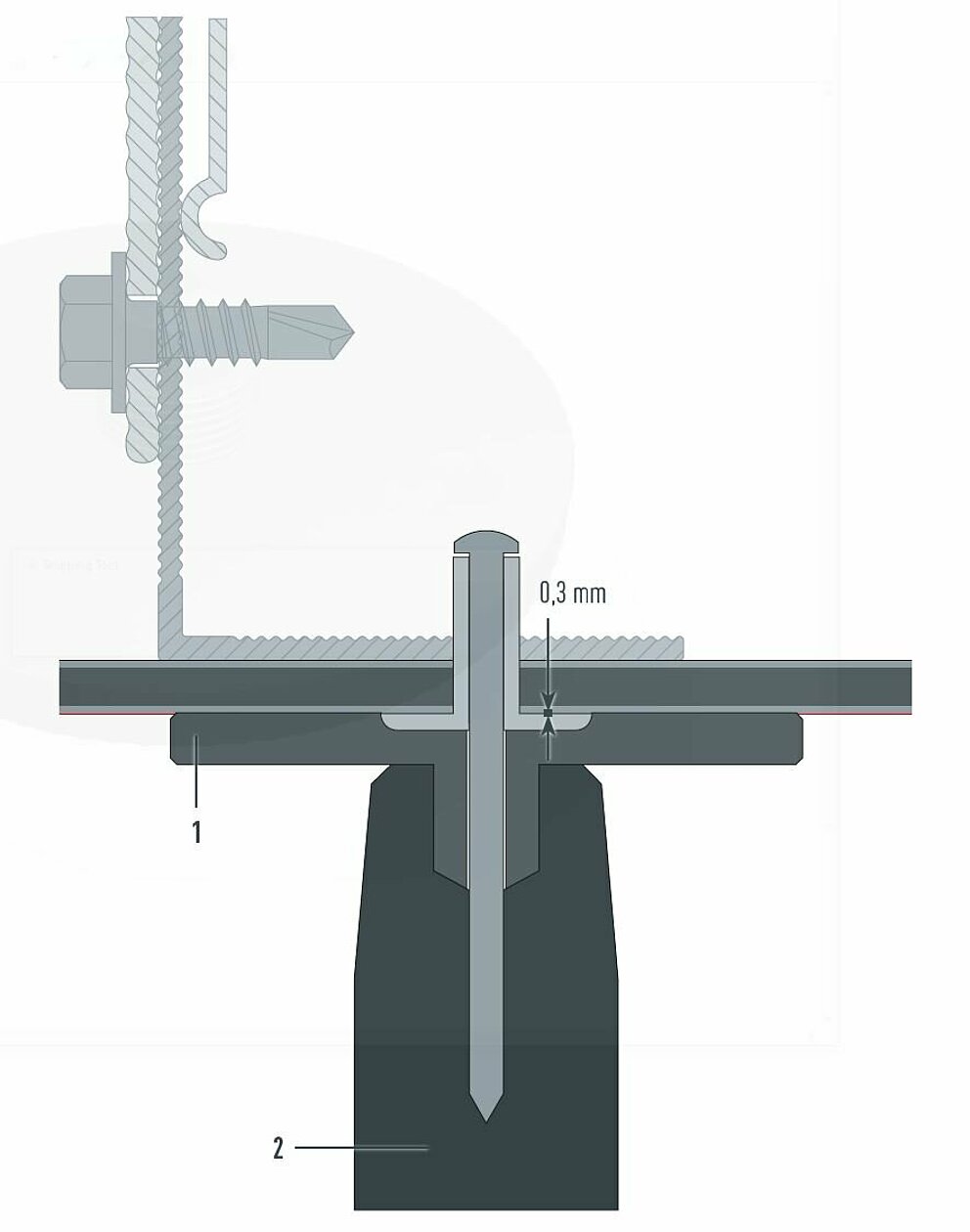 Le système de fixation mécanique par rivetage se compose d’un rivet de façade et, en option, d’une douille de guidage pour point fixe.