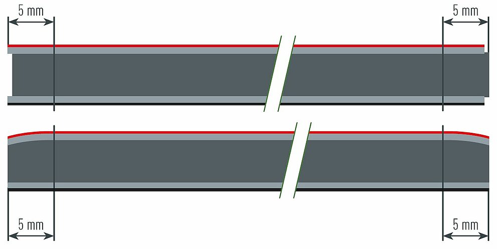 Du fait du procédé de fabrication, on ne peut exclure un léger décalage latéral de la tôle de couverture sur les côtés longs des panneaux composites en aluminium PREFABOND. Sur les côtés courts, les bords de coupe sont apparents.