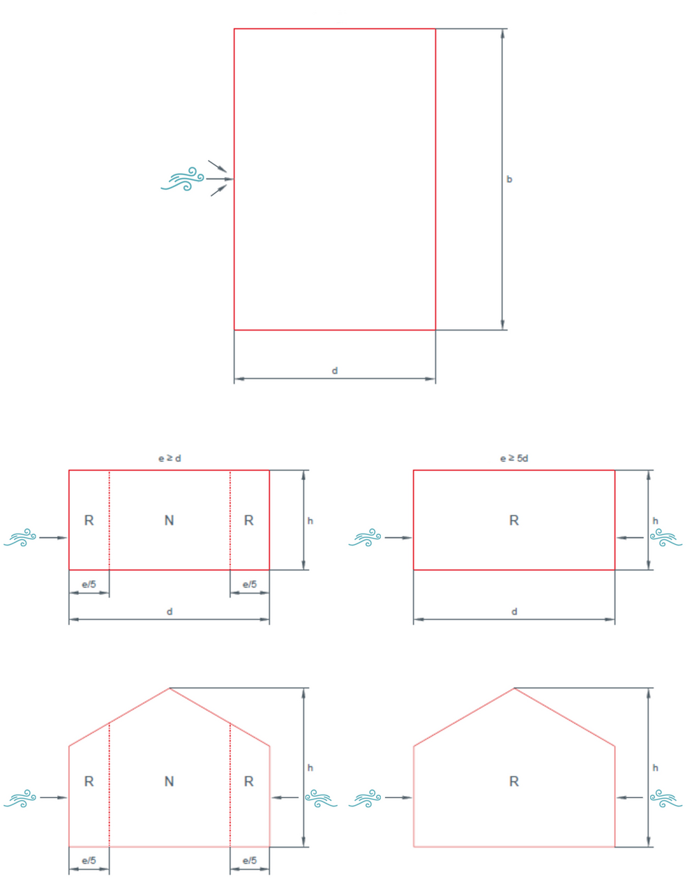 Lors de la pose de couvertures à joint debout, la largeur des bacs et l’espacement des pattes doivent être adaptés aux charges de vent liées au site et au bâtiment. PREFA a mis au point des dimensions simplifiées pour le poseur et les a présentées sous forme de tableau. Ces dimensions simplifiées ne s’appliquent qu’aux bâtiments fermés et aux produits PREFALZ ou FALZONAL® associés à des pattes fixes et des pattes coulissantes PREFA, ainsi qu’aux éléments de fixation (clous/vis) appropriés de PREFA, et en cas de pose sur un voligeage intégral. Les tableaux ont été élaborés à partir de la norme EN 1991-1-4. Les catégories de terrain correspondent à la norme EN 1991-1-4 et la vitesse de référence aux compléments nationaux relatifs à la norme EN 1991-1-4. Dans un souci de clarté, la façade a été divisée en deux zones, chacune portant un nom différent (R = rives, N = zone normale). C’est au niveau des rives du bâtiment que les charges de vent sont les plus fortes et qu’il faut se montrer particulièrement prudent.