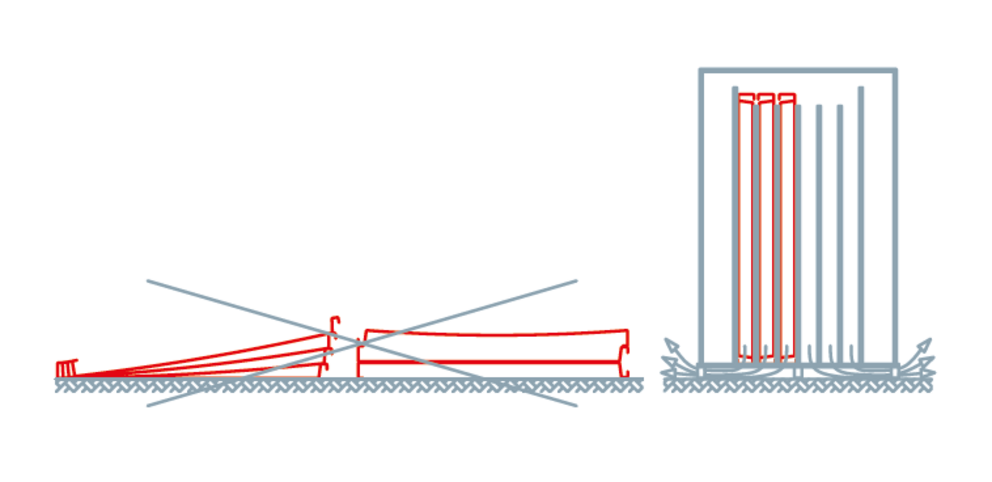 En cas de vent fort, sécurisez les unités ouvertes ou les pièces métalliques pour éviter qu’elles tombent. En cas de pluie, protégez les emballages en carton stockés sur le toit en les recouvrant d’une bâche. Les produits doivent être stockés à la verticale sur une surface plane. Ils doivent être protégés et stockés au sec.