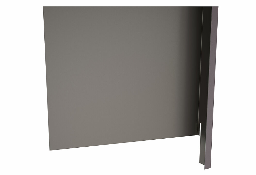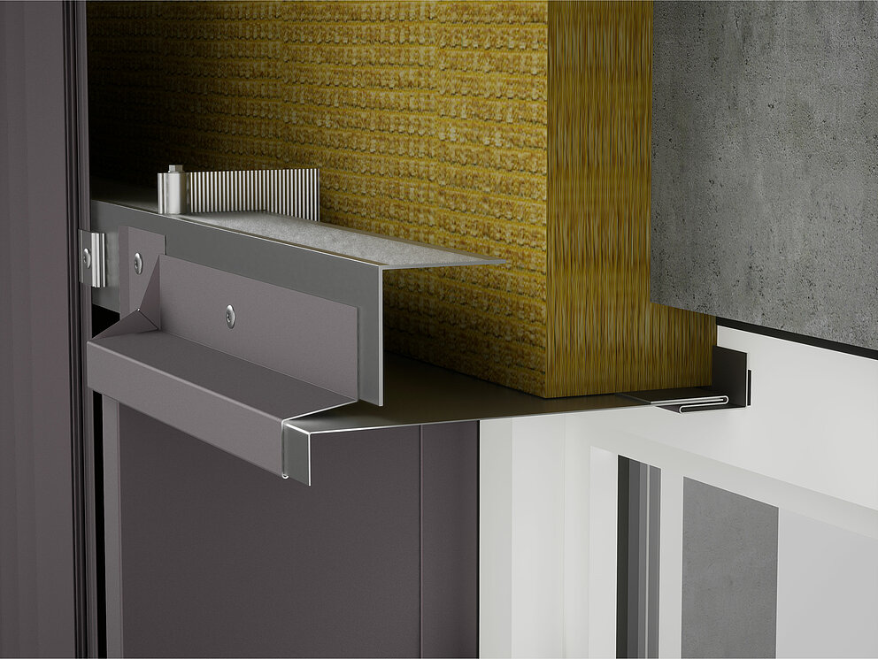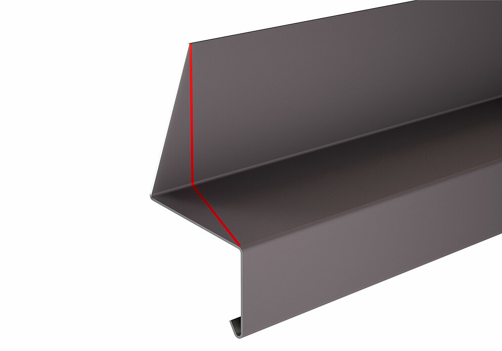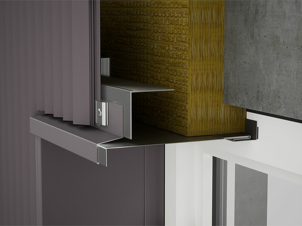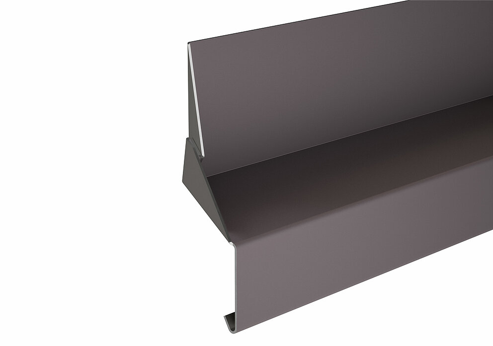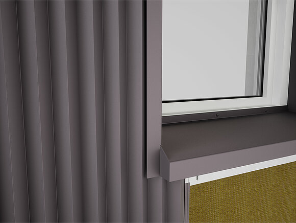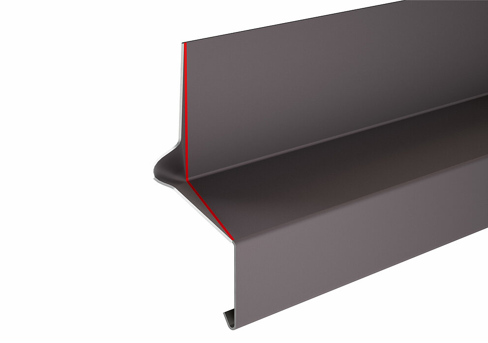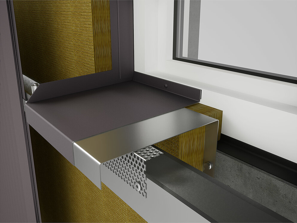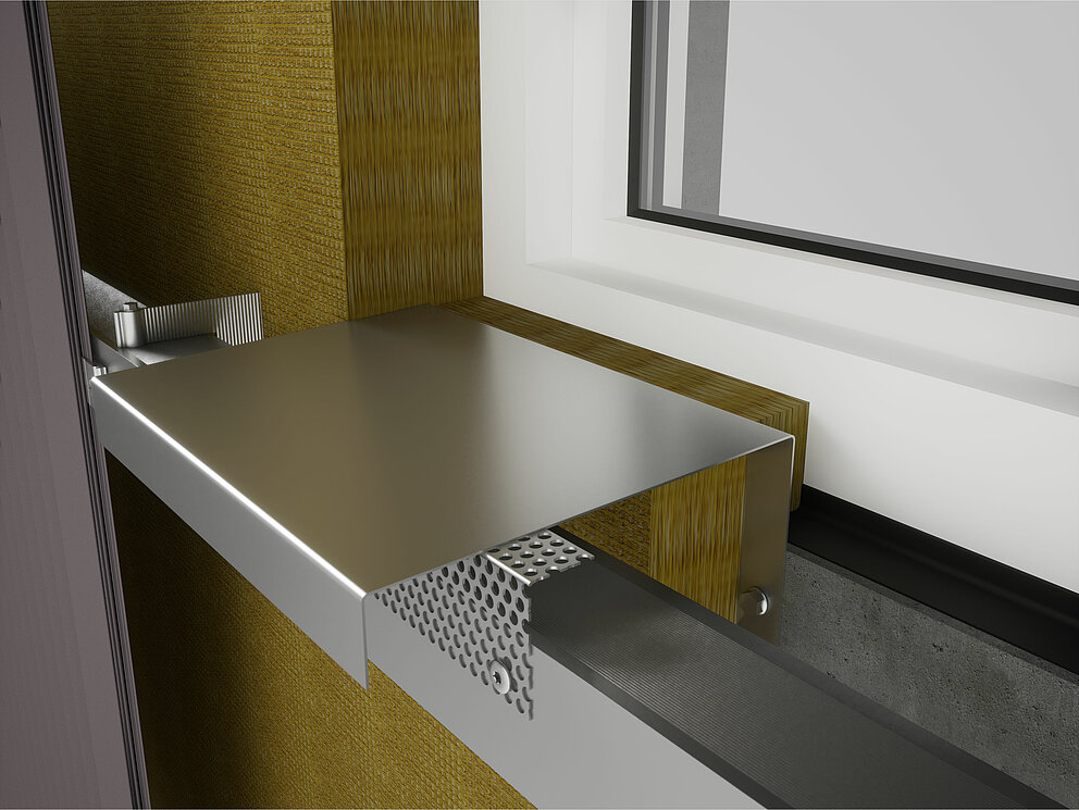 Pliez ensuite un habillage de l'embrasure supérieur en tenant compte des conditions spécifiques du chantier et insérez-le dans le profil de jonction. Le renvoi d’eau est accroché à l’habillage de tableau supérieur.
