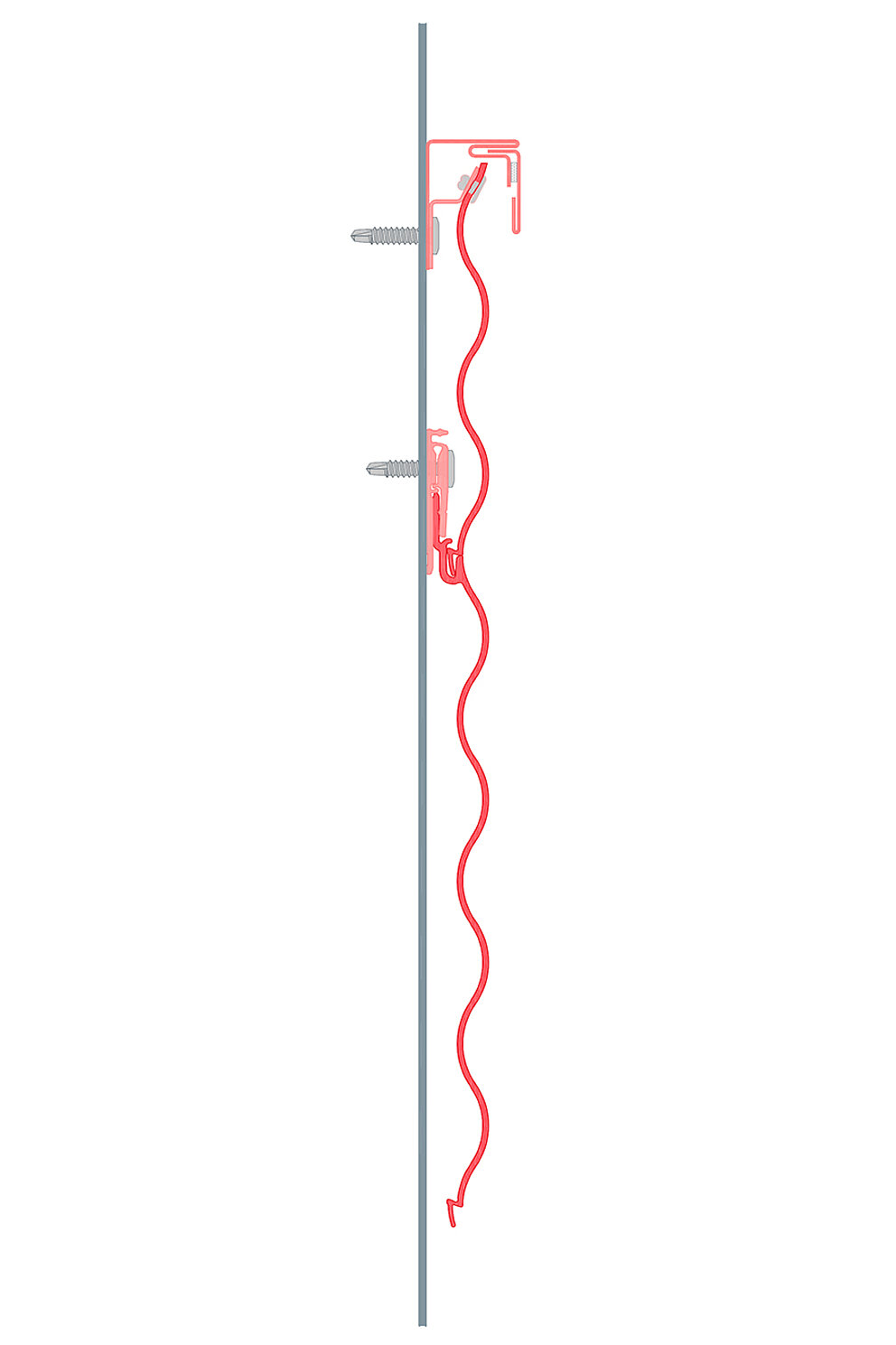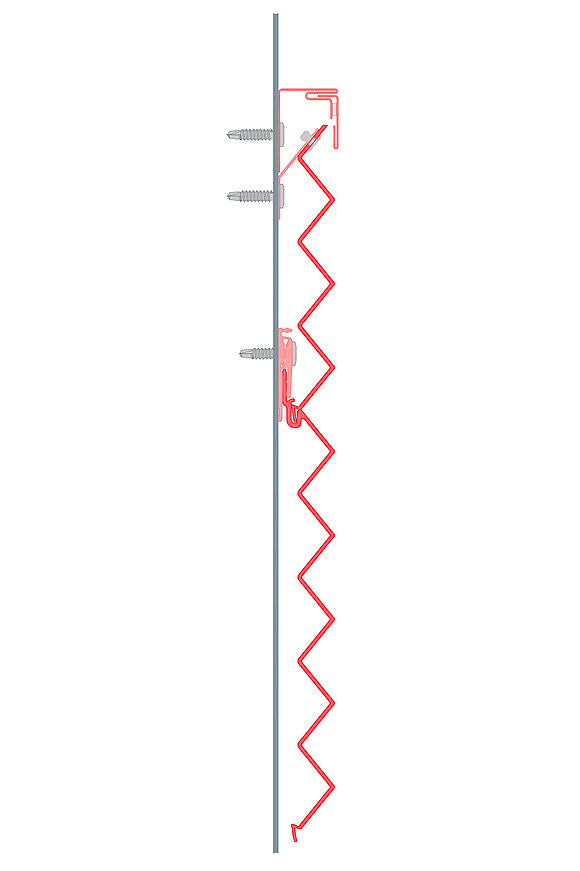 Commencez par monter la patte de maintien sur la sous-construction, puis fixez le profil raccourci sur la patte de maintien à l’aide de rivets brevetés PREFA.