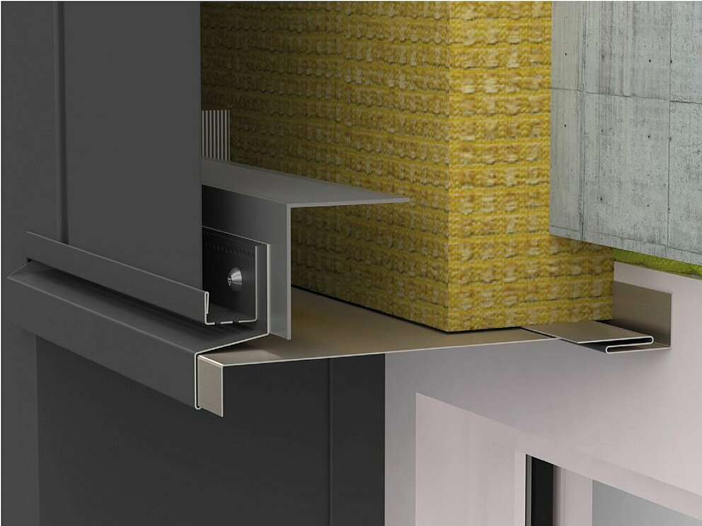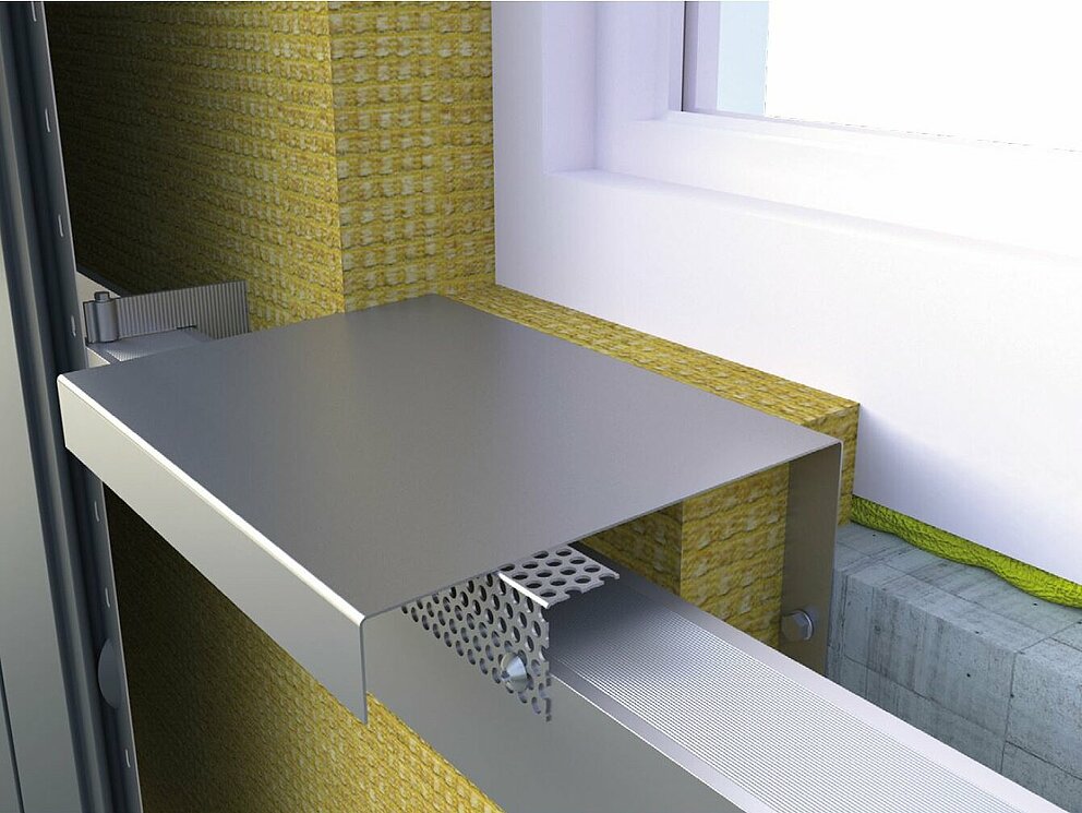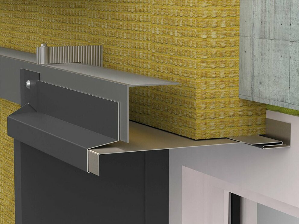 Pliez ensuite un habillage de l'embrasure supérieur en tenant compte des conditions spécifiques du chantier et insérez-le dans le profil de jonction. Le renvoi d’eau est accroché à l’habillage de tableau supérieur.
